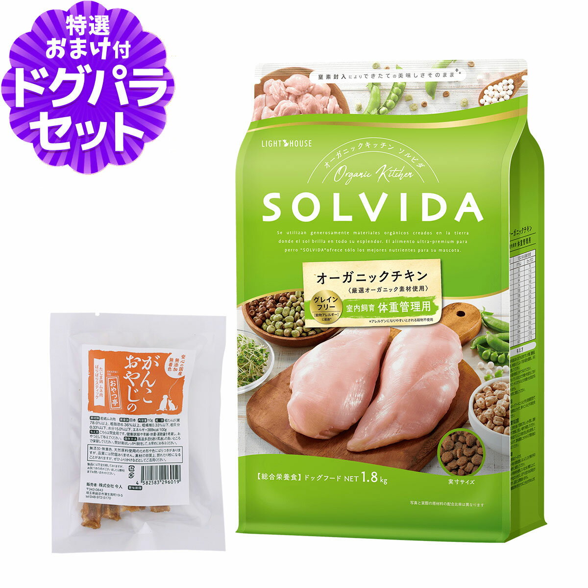 SOLVIDA ソルビダ グレインフリーチキン 室内飼育体重管理用の解説 『人の赤ちゃん基準の安心素材』愛犬にも「人と同じ基準」の食材を。 食品添加物や農薬などを使わない安全性にこだわった原材料のみを使用し、安心して与え続けられるプレミアムドッグフードをお届けします。 『理想的な栄養バランス』20種類以上の厳選された原材料を、最新のペット栄養学に基づいて、ワンちゃんに理想的な栄養バランスで配合しています。 『極めて高い嗜好性』安全で栄養バランスに優れていても「おいしくない」食事ではストレスで逆効果。 ワンちゃんが喜んで食べる「食いつき」にもこだわりました。 ソルビダ グレインフリーチキン 室内飼育体重管理用の詳細 対象 全犬種・室内飼育体重管理が必要な成犬用 ソルビダ グレインフリーチキン 室内飼育体重管理用について 太りやすく体重管理が必要な愛犬に、美味しさそのままに最新のペット栄養学に基づいた理想的な栄養をヘルシーブレンド。 高品質なオーガニックチキン、厳選された野菜やフルーツなど、新鮮なオーガニック原材料を贅沢に使用し、理想的な栄養をバランスよく愛犬に提供します。 さらにアレルギーに配慮し、穀物類は一切使用しておりませんので、腸に負担をかけることなく消化ができます。 また、ユッカシジゲラ抽出物を配合することで、体臭や便臭の軽減をサポートします。 ・愛犬の体重に配慮して、高い嗜好性はそのままに「低脂肪、低カロリー」仕上げ。 ・脂肪燃焼をサポートするL-カルニチン配合。 ・食物アレルギー、穀物類の消化が苦手な愛犬に配慮したグレインフリー(穀物不使用)。 ・穀物の代わりに栄養価が高く消化に優れた豆類を使用。 ・USDA(米国農務省)の厳しいオーガニック基準をクリア。 ・AAFCO栄養基準(総合栄養食) その他 直射日光を避け、風通しの良い場所に保管してください。 ※当店の商品は全て正規品です。 安心してお買い求めください。 ■パッケージ・内容成分などは予告なく変更になることがございます。 ご了承くださいませ。 ソルビダ/インドア/室内犬/アダルト/成犬用/チキン/グレインフリー/ドッグフード原材料 オーガニックチキン生肉、乾燥チキン、オーガニック乾燥豆類、オーガニック乾燥ヒヨコ豆、オーガニックエンドウ豆粉、オーガニックタピオカ粉、オーガニック乾燥アルファルファ、天然フレーバー、オーガニック乾燥ジャガイモ、オーガニック挽き割りフラックスシード、乾燥サーモン、エンドウ豆でんぷん、オーガニックひまわり油*、乾燥トマト繊維、オーガニック乾燥ケルプ、オーガニック乾燥リンゴ、乾燥ビール酵母、サーモンオイル*、チキン軟骨(グルコサミン、コンドロイチン源)、タウリン、オーガニックひまわりの種、乾燥かぼちゃ、乾燥ブルーベリー、オーガニック乾燥にんじん、乾燥ブロッコリー、加水分解酵母(マンナンオリゴ糖源)、オーガニック乾燥クランベリー、乾燥チコリ根(イヌリン、フラクトオリゴ糖源)、乾燥セージ、L-カルニチン、乳酸、ユッカフォーム抽出物、ガーリックパウダー、ミネラル類(食塩、塩化カリウム、プロテイネイテッド亜鉛、プロテイネイテッド鉄、プロテイネイテッド銅、プロテイネイテッドマンガン、ヨウ素酸カルシウム、セレニウム酵母)、ビタミン類(塩化コリン、ビタミンE補助食品、ナイアシン補助食品、ビタミンB1硝酸塩、D-パントテン酸カルシウム、ビタミンA補助食品、ビタミンB6、リボフラビン補助食品、ビタミンD3補助食品、ビオチン、ビタミンB12補助食品、葉酸)、プロバイオティクス微生物(イースト菌、乳酸菌、麹菌、糸状菌、枯草菌)、酸化防止剤(ミックストコフェロール) *ミックストコフェロールで保存 保証成分 たんぱく質24%以上、脂質9%以上、粗繊維6.0%以下、粗灰分9.5%以下、水分10%以下、カリウム1.1%、ナトリウム0.4%、セレニウム酵母0.35mg/kg以上、ビタミンA 5,000 IU/kg以上、ビタミンE 50 IU/kg以上、オメガ6脂肪酸1.6%以上、オメガ3脂肪酸0.75%以上、リン1.1% カロリー 310kcal/100g 原産国 アメリカ 対象年齢 室内飼育体重管理が必要な成犬用 給与量目安 上記の給与量はあくまでも目安です。 ペットの犬種、運動量、健康状態、体重などによって、給与量を調節し、与えすぎに注意してください。 ・1日の給与量を数回に分けて与えてください。 ・ソルビダは、バランスのとれた栄養分を配合しております。 ビタミンやミネラルなどの栄養分を添加する必要はありません。 ・常に新鮮な水を用意してください。 ソルビダ グレインフリーへの切り替えに際してのお願い 穀物入りのフードからグレインフリー(穀物不使用)フードへ切り替える場合、腸内の消化酵素の準備が整うまで、便がゆるくなる場合がございます。 ワンちゃんの胃腸に負担がかからないよう、少量を従来のフードに混ぜて1週間〜10日ほどかけて、切り替えるようにしてください。 ご注意 ※開封後は、空気を抜いて開封口をしっかり閉じ、乾燥した涼しい場所で保管し