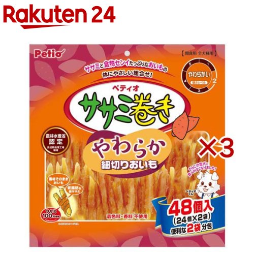 お店TOP>ペット用品>犬用食品(フード・おやつ)>犬用おやつ(間食・スナック)>スナック(犬用)>ササミ巻き やわらか細切りおいも 犬用 (48個入×3セット)【ササミ巻き やわらか細切りおいも 犬用の商品詳細】●食物繊維たっぷり細切りおいもに低脂肪な鶏ササミを巻いて小型犬にもぴったりなやわらかさ・サイズに仕上げました。 ●着色料・香料不使用。 ●農林水産省認定 鳥加熱処理工場製造。 【ササミ巻き やわらか細切りおいも 犬用の原材料】鶏ササミ、さつまいも、グリセリン、保存料(ソルビン酸K)【栄養成分】たん白質23.0%以上、脂質0.5%以上、粗繊維1.0%以下、灰分9.0%以下、水分33.0%以下【保存方法】・直射日光・高温多湿の場所をさけて保存してください。 ・内袋開封後は必ず封をして冷蔵庫で保存し、賞味期限に関わらずなるべく早くお与えください。 【原産国】中国【発売元、製造元、輸入元又は販売元】ペティオこちらの商品は、ペット用の商品です。 ※説明文は単品の内容です。 商品に関するお電話でのお問合せは、下記までお願いいたします。 ペティオ:0120-133-035アドメイト:0120-133-077リニューアルに伴い、パッケージ・内容等予告なく変更する場合がございます。 予めご了承ください。 ・単品JAN:4903588143069ペティオ東京都港区芝1-10-11広告文責:楽天グループ株式会社電話:050-5577-5043[犬用品] ササミ巻き やわらか細切りおいも 犬用(48個入×3セット) 2,708 円
