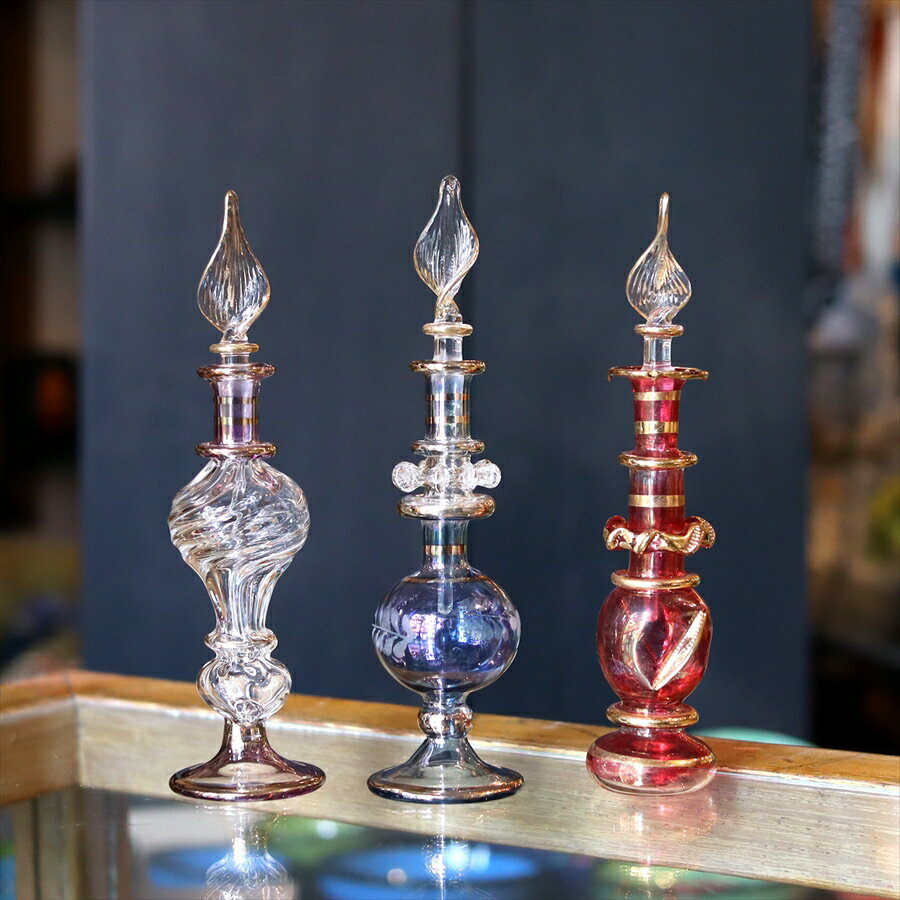 ⇒エジプト香水瓶一覧へエジプト香水瓶 3本セット ガラスボトル クレオパトラ商品番号eg6924サイズ12.5cm/ 12.5cm/ 12.5cm素 材ガラス産 地エジプトアラビアンな輝きの香水瓶。 約12cmの高さのミニサイズ3本セットです。 エジプトのカイロにて職人さんが一つ一つ手作りで作っているので、カラーやデザインのバリエーションも様々です。 切子細工で表現された草花モチーフやゴールドの着彩、フリル状のガラスなど小さいながらも職人さんの技が光っています。 実際に香水瓶として使うこともできますが、密閉性が低いので、置物・飾り・一輪挿しなどとしてお楽しみください。 ※箱はついていません。 エアキャップで包んでお届けします。 Egyptian purfume bottle, Aroma pot, glass bottle, Arabian night, Cairo, khan khalili, ガラス香水瓶・エジプト香水瓶・涙壺, エジプトガラス・エジプト・お土産・カイロ・ハンハリーリ, ガラス工芸・アロマポット・エジプト・ハンドメイド・カイロ・香油・乳香, ハーバリウムボトル 【10%OFFクーポン対象】エジプト香水瓶 3本セット ガラスボトル クレオパトラ 4,290 円