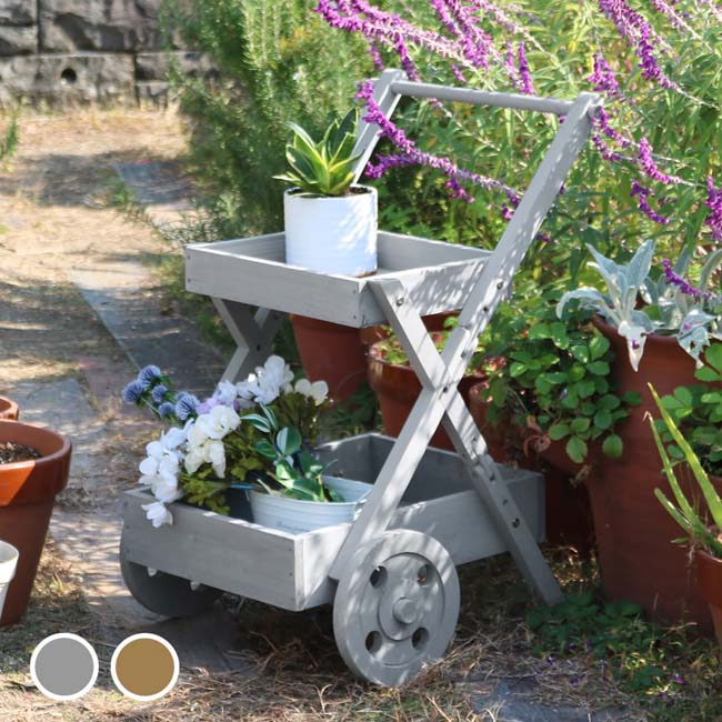 ※ほかの商品との同梱不可。 北海道・沖縄・離島は別途送料が必要となります。 「パリのマルシェをあなたのお庭に」 【新鮮な果物やお花が並び、見ているだけでワクワクするようなパリのマルシェ】をイメージした、ワゴン型のプランタースタンドです。 買ってきた苗をそのままポンと入れて、寄せ植えにしたり、ガーデングッズを収納したり。 キッチンでコーヒーメーカーや根菜の置き場にしても可愛いですよ。 1.雰囲気満点のかわいいフォルム ほっこり癒しのワゴン型デザイン。 作家さんのハンドメイド作品のような、心あたたまるナチュラルアンティーク。 2.アースカラー×天然木の優しい雰囲気 人気のライトブラウン&グレーの2カラー。 どちらも植物との相性が良く、しっかりグリーンを引き立てます。 3.ガーデングッズも一緒に 散乱しがちな園芸用品をひとまとめにするだけで、お庭の一角が”魅せる場所”に。 お手入れもはかどります。 4.高さがある分、お手入れしやすい 水抜き穴があるので、プランターを入れたまま水やりができます。 5.ダイニング・ワゴンとしても 調味料やカトラリー、ティッシュ、新聞等、ダイニングに必要なものをひとまとめに。 ※キャスターは飾りです。 6.室内での”定位置決め”にも■商品名 天然木製ワゴン型プランタースタンド ■カラー・型番 ライトブラウン…FW72LBR グレー…FW72GRY ■サイズ(約) 幅 480×奥行 520×高さ 710mm ■重量(約) 4.4kg ■材質 天然木 ■仕上げ ステイン塗装 ■組立区分 組立式 ■組立目安時間 2人で20分 ※北海道・沖縄・離島は別途送料が必要となります。