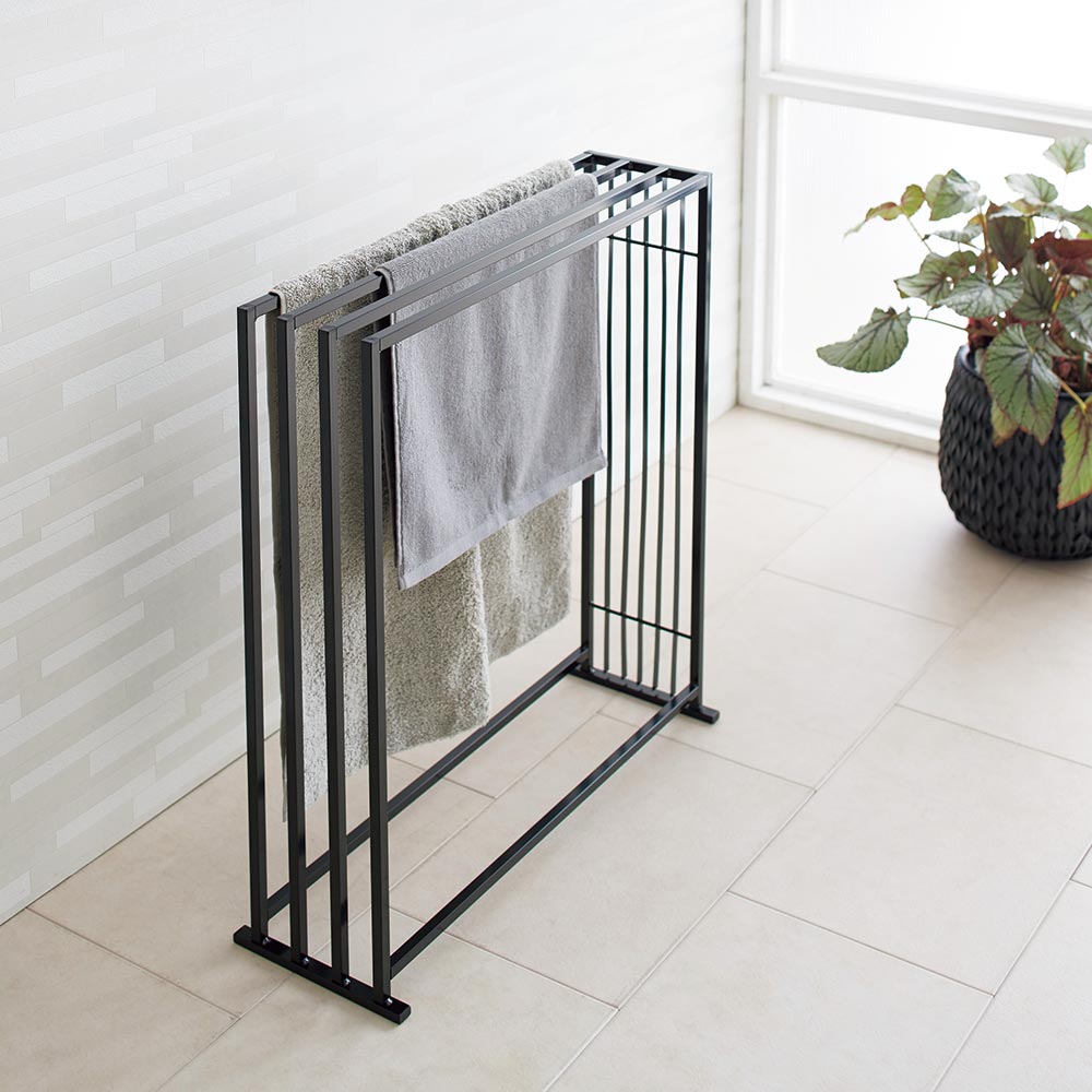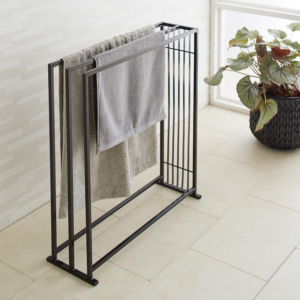 縦格子がスマートなタオルハンガー。 人気のハンジシリーズにタオル収納が登場しました。 狭いサニタリールーム、洗面台周りでも使いやすい薄型設計。 スポーツタオルからバスマット、大判のバスタオルまでかけられるタオル用物干しです。 片側からさっとかけやすい設計にもこだわりました。 人気のハンジシリーズにタオルハンガーが登場場所をとらないスマートなフォルムに、縦に連なるラインがアクセント。 片側からサッとタオルがかけられる掛けやすさにもこだわりました。 薄型ながらスポーツタオルからバスマット、大判のバスタオルにも対応できる設計です。 格子のラインが美しい和モダンなデザインのタオルハンガー●格子のサイドラインは単なるデザインだけでなく、目隠しにもなるこだわり設計です。 ●シックな印象のブラックのスチールフレームがシンプルモダンな印象。 スタイリッシュなランドリー空間を演出します。 ●別売のハンジランドリーラックシリーズと合わせて使えばランドリー周りをよりすっきりお洒落に収納できます。 ●スチール製のフレームにカチオン電着塗装を施しているので汚れてもお手入れが楽です。 ●ブルックリンスタイルやシックモダンスタイルにも馴染む、シンプルな作りにこだわりました。 安心と信頼の国内生産品日本の熟練の家具職人がひとつずつ丁寧に仕上げたワンランク上の商品です。 国産家具だからこその丁寧な仕上がりにより、安心して長くお楽しみいただけます。 面倒な組み立てのない完成商品商品は、組立不要の完成品でお届けします。 届いたらすぐにご利用いただけるのも嬉しいポイントです。 ページ下部に画像の説明がございます。 一部別売りの商品もございますので、説明文ご確認のうえご注文ください。 >画像の説明はこちら<仕様・サイズ■サイズ:幅66.5cm 奥行21.6cm 高さ71cm■素材:本体…スチール(カチオン電着塗装)■キズ防止クッションシール付き■日本製【送料マーク:B】 この商品の配送料は2500円(税込)です。 ※沖縄県へのお届けは上記に地域特別配送料2200円(税込)が追加されます。 画像の説明薄型スマートデザインでバスタオルが掛けやすい、シンプルモダンなハンガーです。 ※4連タイプ大判のタオルも横からサッとかけられます。 4連(裏)4連(表)場所をとらないスマートなフォルムに、縦に連なるラインがアクセント。 格子がさりげない目隠しになります。 狭いサニタリールーム、洗面台周りでも使いやすい薄型設計。 スポーツタオルからバスマット、大判のバスタオルまでかけられるタオル用物干しです。 シリーズコーディネート例 ※写真のタオルハンガーは3連タイプ 【クーポン配布 1月16日1:59迄】 Hanji/ハンジ タオルハンガー 4連 幅66.5cm 奥行21.6cm 高さ71cm バスタオルスタンド ハンガー バス用品 バスマット H92132 17,900 円