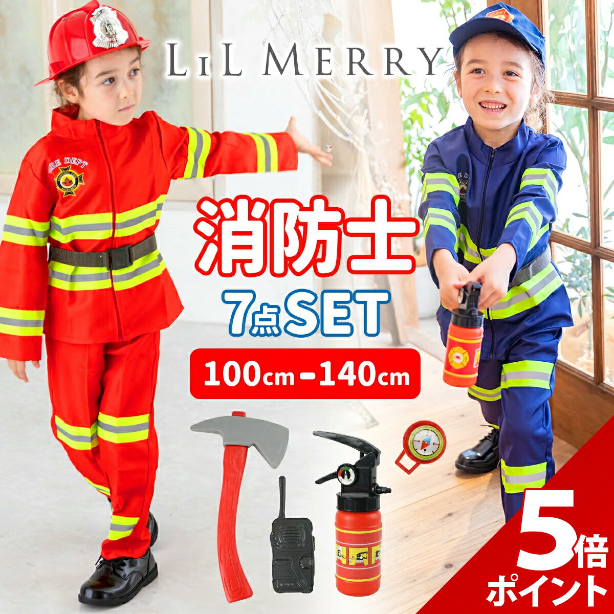 ハロウィン コスプレ 子供 男の子 消防士 衣装 キッズ 消防隊員 仮装 子ども 職業 コスチューム 女の子 帽子 ヘルメット セット 【 本格7点フルセット 】コスプレに必要なものが全てセットになっています。 すぐに憧れの勇敢な『消防士』に変身することが出来ます。 【 選べる2カラー 】お子様のお好みで選べる2カラーをご用意。 男の子も女の子も着用できます。 【 クールなデザイン 】反射バーがキラリと光る本物そっくりなコスチューム!デザイン、質感までこだわった衣装です。 【 小物も充実 】消防隊員には欠かせない、ヘルメットやレスキューハンマーなどセット内容も充実♪小物の品質も高いので、よりリアリティーな消防士を演出できます。 【 様々なシーンで大活躍 】ハロウィンやお誕生パーティーにピッタリ!なりきりごっこが大好きなお子様へのプレゼントにもおすすめです。 ご購入から30日間はメーカー保証付きです。 メーカー希望小売価格はメーカーサイトに基づいて掲載していますe0608 【 本格7点フルセット 】コスプレに必要なものが全てセットになっています。 すぐに憧れの勇敢な『消防士』に変身することが出来ます。 【 選べる2カラー 】お子様のお好みで選べる2カラーをご用意。 男の子も女の子も着用できます。 【 クールなデザイン 】反射バーがキラリと光る本物そっくりなコスチューム!デザイン、質感までこだわった衣装です。 【 小物も充実 】消防隊員には欠かせない、ヘルメットやレスキューハンマーなどセット内容も充実♪小物の品質も高いので、よりリアリティーな消防士を演出できます。 【 様々なシーンで大活躍 】ハロウィンやお誕生パーティーにピッタリ!なりきりごっこが大好きなお子様へのプレゼントにもおすすめです。 ■セット内容■ 上着、ズボン、ベルト、帽子 or ヘルメット、レスキューハンマー、トランシーバー、消火器、コンパス(ブルーのみ) ■サイズ(約)■ ブルー 100:着丈44cm 胸74cm以内 ウエスト34-54cm ズボン丈54cm 110:着丈45cm 胸囲76cm以内 ウエスト36-58cm ズボン丈60cm 120:着丈48.5cm 胸囲80cm以内 ウエスト40-60cm ズボン丈66.5cm 130:着丈51cm 胸囲81cm以内 ウエスト42-64cm ズボン丈72cm 140:着丈55cm 胸囲85cm以内 ウエスト42-62cm ズボン丈78.5cm レッド 100:着丈40cm 胸囲64cm以内 ウエスト34-44cm ズボン丈55cm 110:着丈43cm 胸囲71cm以内 ウエスト34-50cm ズボン丈63cm 120:着丈46.5cm 胸囲73cm以内 ウエスト34-54cm ズボン丈67cm 130:着丈48.5cm 胸囲77cm以内 ウエスト40-60cm ズボン丈74cm 140:着丈53cm 胸囲86cm以内 ウエスト42-62cm ズボン丈79cm ※寸法は平置きにて計測し、若干の誤差がある場合がございます。 トランシーバー13.5cm レスキューハンマー26cm 14cm ブルー帽子 56cm以内 ■素材■ 服:ポリエステル 小物:プラスチック ※商品写真はできる限り実物の色に近づけるよう調整しておりますが、お客様のお使いのモニター設定、お部屋の照明等により実際の商品と色味が異なる場合がございます。 恐れ入りますが色味が理由によるご返品はお受けしておりませんので、予めご了承ください。 ご理解頂きたいこと 当商品の検品について ご注文前にご確認下さい ●よくあるご質問● 【マラソン限定★P+5倍!】【本格7点フルセット】ハロウィン 衣装 子供 男の子 消防士 消防隊員 レスキュー隊 キッズ 子ども コスプレ コスチューム 仮装 女の子 職業 帽子 ヘルメット 消火器 セット 消防士 3,980 円