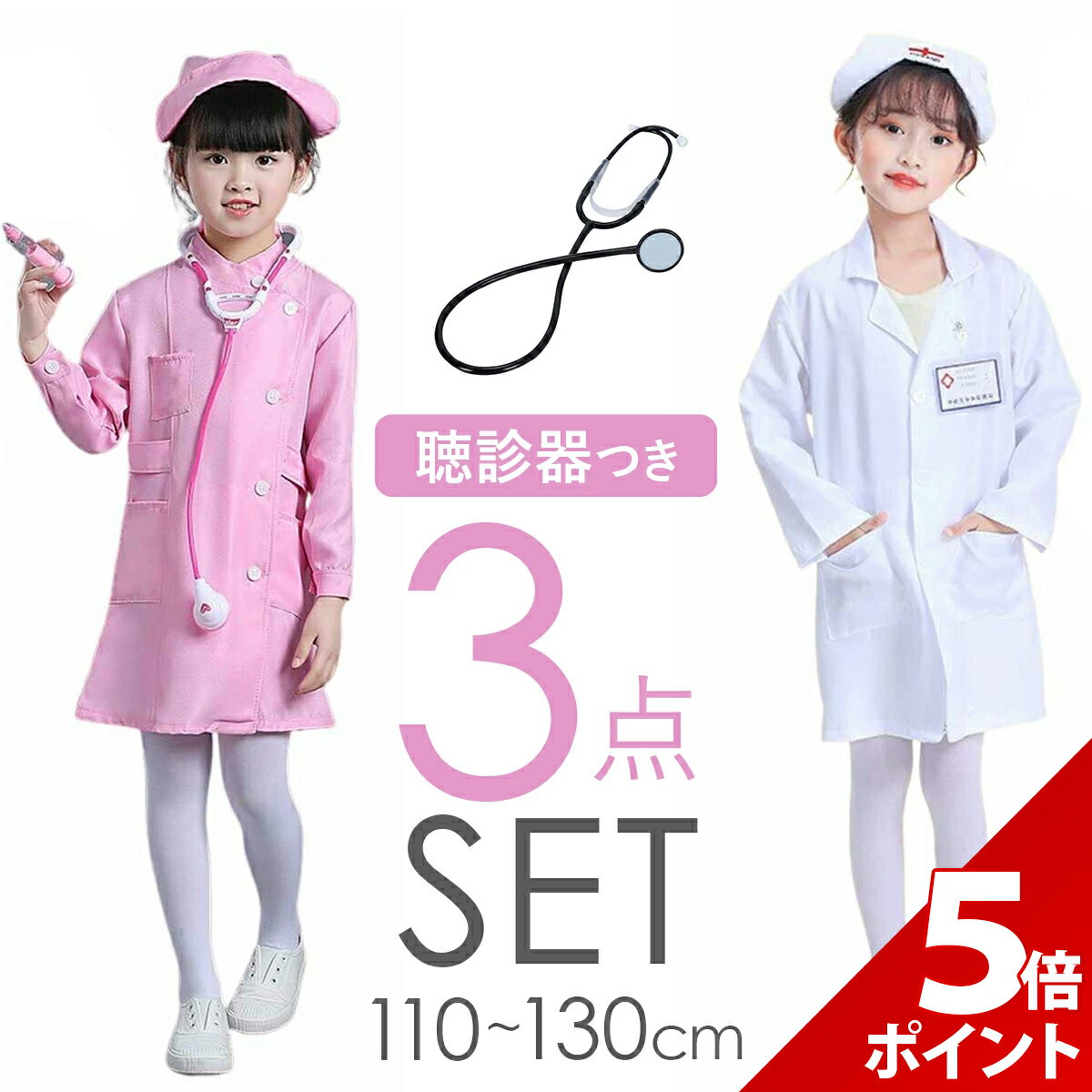 ナース コスプレ 子供 女の子 看護師 衣装 子ども 服 ハロウィン コスチューム 医者 コス ドクター 制服 白衣 聴診器 セット 【 本格3点フルセット 】コスプレに必要なものが全てセットになっています。 すぐに憧れの『ナース』に変身することが出来ます。 【 小物も充実 】看護師さんには欠かせない、ナースキャップや聴診器などセット内容も充実♪小物の品質も高いので、よりリアリティーなナースを演出できます。 【 高品質な生地 】サラサラとした質感と鮮明な色で高級感があります。 シワになりにくい扱いやすい素材で、着心地もバツグンです。 【 選べるカラー&サイズ 】お子様のお好みで選べる2カラーをご用意。 サイズが豊富なので、お子様の身長にピッタリ合ったジャストサイズを選べます。 【 様々なシーンで大活躍 】ハロウィンやお誕生パーティーにピッタリ!なりきりごっこが大好きなお子様へのプレゼントにもおすすめです。 ご購入から30日間はメーカー保証付きです。 メーカー希望小売価格はメーカーサイトに基づいて掲載していますe0628 【 本格3点フルセット 】コスプレに必要なものが全てセットになっています。 すぐに憧れの『ナース』に変身することが出来ます。 【 小物も充実 】看護師さんには欠かせない、ナースキャップや聴診器などセット内容も充実♪小物の品質も高いので、よりリアリティーなナースを演出できます。 【 高品質な生地 】サラサラとした質感と鮮明な色で高級感があります。 シワになりにくい扱いやすい素材で、着心地もバツグンです。 【 選べるカラー&サイズ 】お子様のお好みで選べる2カラーをご用意。 サイズが豊富なので、お子様の身長にピッタリ合ったジャストサイズを選べます。 【 様々なシーンで大活躍 】ハロウィンやお誕生パーティーにピッタリ!なりきりごっこが大好きなお子様へのプレゼントにもおすすめです。 ■セット内容■ <ピンク>ナース服、帽子、聴診器 <ホワイト>白衣、帽子、聴診器 ■サイズ(約)■ <ピンク> 110:着丈57cm 胸囲76cm以内 ウエスト72cm以内 袖丈34cm 120:着丈62cm 胸囲78cm以内 ウエスト74cm以内 袖丈37cm 130:着丈66cm 胸囲80cm以内 ウエスト76cm以内 袖丈40cm <ホワイト> 110:着丈59cm 胸囲76cm以内 袖丈34cm 120:着丈64cm 胸囲78cm以内 袖丈38cm 130:着丈68cm 胸囲80cm以内 袖丈43cm ※寸法は平置きにて計測し、若干の誤差がある場合がございます。 ■カラー■ 2色(ピンク・ホワイト) ■素材■ ポリエステル <ボタンホールの穴開けについて> 本商品は製造コスト削減の為、ボタンホールの穴開けをご購入者様にお願いしております。 穴開け部分のボタンホール縫いは済んでおりますので、カッターナイフやハサミで穴を開けるだけでご使用いただけます。 ※商品写真はできる限り実物の色に近づけるよう調整しておりますが、お客様のお使いのモニター設定、お部屋の照明等により実際の商品と色味が異なる場合がございます。 恐れ入りますが色味が理由によるご返品はお受けしておりませんので、予めご了承ください。 ご理解頂きたいこと 当商品の検品について ご注文前にご確認下さい ●よくあるご質問● 【マラソン限定★P+5倍!】【5点セット】ナース 衣装 女の子 子ども 子供 看護師 ドクター ハロウィン コスチューム コスプレ コス かわいい 看護師 制服 服 医者 ドクター 聴診器 セット 3,499 円