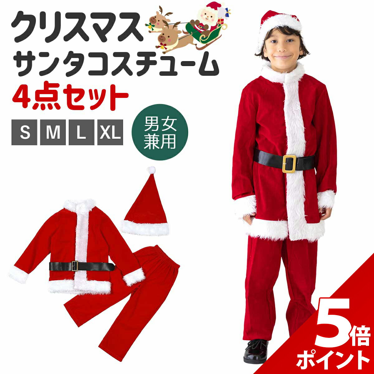 サンタ コスプレ 子供 クリスマス 衣装 キッズ サンタコス サンタクロース 仮装 可愛い サンタさん コスチューム 女の子 男の子 Christmas サンタ服 ・赤×白の王道カラーで、誰でも気軽にサンタに変身。 写真映えも抜群で、素敵な思い出を残せます。 ・サンタらしさを引き立てる小物も付属。 フルセットで簡単にクリスマスコーデが完成します。 ・着心地を重視した柔らかな生地で仕立てられており、長時間の着用でも快適さをキープします。 ・豊富なサイズ展開で、ぴったりフィットするものを選べるので、最適なフィット感で動きやすさ抜群です。 ・ホームパーティーや学校・園のイベントなど、さまざまなシーンでクリスマスムードを盛り上げる必須アイテムです。 ご購入から30日間はメーカー保証付きです。 メーカー希望小売価格はメーカーサイトに基づいて掲載していますe0948 ・赤×白の王道カラーで、誰でも気軽にサンタに変身。 写真映えも抜群で、素敵な思い出を残せます。 ・サンタらしさを引き立てる小物も付属。 フルセットで簡単にクリスマスコーデが完成します。 ・着心地を重視した柔らかな生地で仕立てられており、長時間の着用でも快適さをキープします。 ・豊富なサイズ展開で、ぴったりフィットするものを選べるので、最適なフィット感で動きやすさ抜群です。 ・ホームパーティーや学校・園のイベントなど、さまざまなシーンでクリスマスムードを盛り上げる必須アイテムです。 ■セット内容■ 4点セット(上着、ズボン、帽子、ベルト) ■サイズ(約)■ XS:着丈44cm 胸囲68cm以内 ズボン丈60cm ウエスト42-62cm 適正身長95-110cm S:着丈50cm 胸囲70cm以内 ズボン丈70cm ウエスト48-67cm 適正身長110-125cm M:着丈56cm 胸囲82cm以内 ズボン丈80cm ウエスト54-78cm 適正身長125-140cm L:着丈68cm 胸囲85cm以内 ズボン丈90cm ウエスト60-88cm 適正身長140-150cm 帽子:頭囲54cm ※寸法は平置きにて計測し、1-3cm程度の誤差がある場合がございます。 ※ベルトはベルト穴を追加してサイズ調整をお願いいたします。 ■素材■ ポリエステル ※商品写真はできる限り実物の色に近づけるよう調整しておりますが、お客様のお使いのモニター設定、お部屋の照明等により実際の商品と色味が異なる場合がございます。 恐れ入りますが色味が理由によるご返品はお受けしておりませんので、予めご了承ください。 ご理解頂きたいこと 当商品の検品について ご注文前にご確認下さい ●よくあるご質問● 【マラソン限定★P+5倍!】サンタ コスプレ 子供 クリスマス 衣装 キッズ サンタコス サンタクロース 仮装 可愛い サンタさん コスチューム 女の子 男の子 Christmas サンタ服 幼児 小学生 95 100 110 120 130 140 150 3,980 円