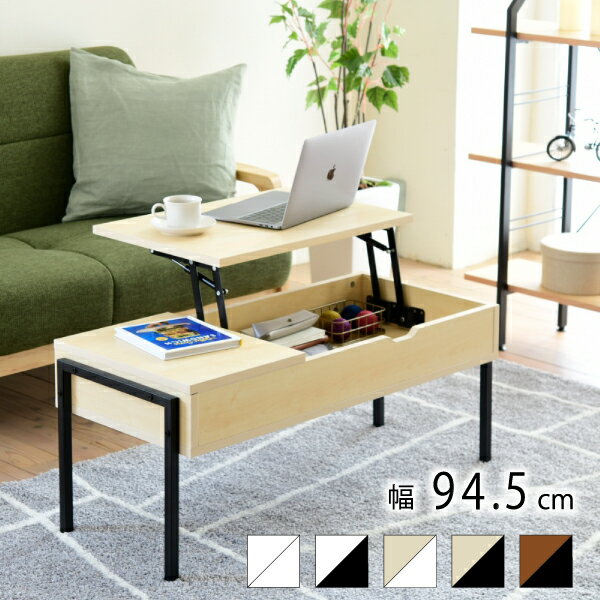■商品説明 5カラー展開のリフトアップテーブル。 爽やかなホワイトから温かみのあるナチュラル、クールなブラウンまでお部屋の雰囲気やお好みにあわせて選べます。 仕事をするときや食事をするときは天板をリフトアップすれば、手元に作業面が来るので楽な姿勢でお使いいただけます。 普段は天板を閉じてリビングテーブルとして、幅広いシーンでご使用いただけるテーブルです。 ■本体サイズ[外寸](リフト閉)幅94.5×奥行42.5×高さ40cm (リフト開)幅94.5×奥行64.5×高さ54cm■その他サイズ[内寸] (リフト部天板)幅59×奥行40cm (天板内収納部)幅48.5(有効56)×奥行36cm×高さ10.5cm (引き出し上天板)幅30×奥行40cm (引き出し)幅20×奥行27.5×高さ7(有効8)cm (脚間)幅90×奥行29.5×高さ26cm■材質[フレーム]スチール(粉体塗装) [棚板]合成樹脂化粧パーティクルボード(メラミン樹脂)■収納量・耐荷重[天板](リフト閉)約10kg以下(リフト開)約5kg以下 [天板下収納部]約7kg以下 [引き出し]約5kg以下■備考・六角レンチ同梱 ・商品によって色味や木目などの風合いが異なります。 ■生産国中国■組立時間(目安)(大人2人)お客様組立(15分)■キーワードテーブル センターテーブル 天板昇降 天板昇降式 昇降テーブル 昇降式テーブル リフティング リフト リフトアップ リフト天板 リフトアップ天板 リフティング天板 ローテーブル 木製テーブル 木目 鉄脚 黒 ブラック 白 ダークブラウン ブラウン ビンテージ インダストリアル モダン かわいい おしゃれ 一人暮らし リモートワーク 在宅 在宅勤務 在宅ワーク 事務 仕事 パソコン 勉強 脚 収納付き 昇降デスク 引き出し付き 油圧 リビング ロータイプ 油圧式 高さ調節 ソファー用 ロー 昇降式 リビングテーブル 幅94.5 引き出し ソファ テレワーク ナチュラル ヴィンテージ ホワイト 北欧 木製 長方形 リフトアップテーブル リフトテーブル 収納 送料無料 18,990 円