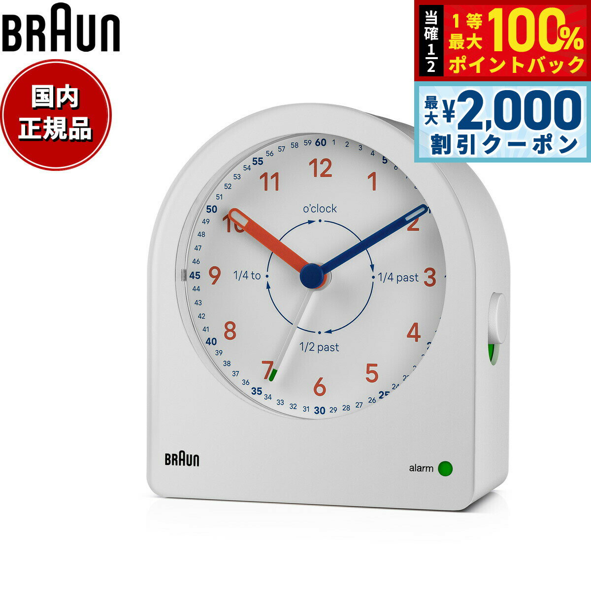 BRAUNのクロックコレクションから、子供が時間の数え方、時計の読み方を学びながら、大人もインテリアとしても楽しめる「タイムティーチャー」シリーズ。 ホワイトダイヤルにオレンジとブルーの配色が見やすくて楽しい2つのクロックは、ただ時刻を知るだけではなく、子供たちが時間の数え方、時計の読み方を学ぶことができます。 そのため、メモリにはオレンジの12進法表記に加え、外側に60進法の細かい数字がふられています。 また、内側の円の周りには、「past」や「to]の文字が記載され、英語での時間の読み方を学ぶことができます。 勿論、子供部屋だけでなく、リビングやキッチン、ベッドサイドに置いてもインテリアとして楽しく、部屋を明るい雰囲気に演出してくれます。 入学や進学のお祝い、お引越しのギフトにもお薦めです。 商品名BRAUN ブラウン アラームクロック BC22TW アナログ 目覚まし時計 置き時計 Alarm Clock 82mm タイムティーチャー Time Teacher ホワイト商品番号BC22TWブランドブラウン BRAUNムーブメントクォーツ アラームスヌーズライト時分針先端ルミナス単三電池3本で作動※電池をお使いいただく際に「充電式(1.2V)」では、電圧不足のため不具合が生じる場合がございます。 市販されております乾電池をご使用下さい。 風防素材プラスチックケース素材プラスチックケースサイズ97×82mmケース厚42mm文字盤カラーホワイト本体重量125g保証期間メーカー1年間保証付属保証カード / 専用BOXBRAUN ブラウン アラームクロック BC22TW アナログ 目覚まし時計 置き時計 Alarm Clock 82mm タイムティーチャー Time Teacher ホワイトBRAUNのクロックコレクションから、子供が時間の数え方、時計の読み方を学びながら、大人もインテリアとしても楽しめる「タイムティーチャー」シリーズ。 ホワイトダイヤルにオレンジとブルーの配色が見やすくて楽しい2つのクロックは、ただ時刻を知るだけではなく、子供たちが時間の数え方、時計の読み方を学ぶことができます。 そのため、メモリにはオレンジの12進法表記に加え、外側に60進法の細かい数字がふられています。 また、内側の円の周りには、「past」や「to]の文字が記載され、英語での時間の読み方を学ぶことができます。 勿論、子供部屋だけでなく、リビングやキッチン、ベッドサイドに置いてもインテリアとして楽しく、部屋を明るい雰囲気に演出してくれます。 入学や進学のお祝い、お引越しのギフトにもお薦めです。