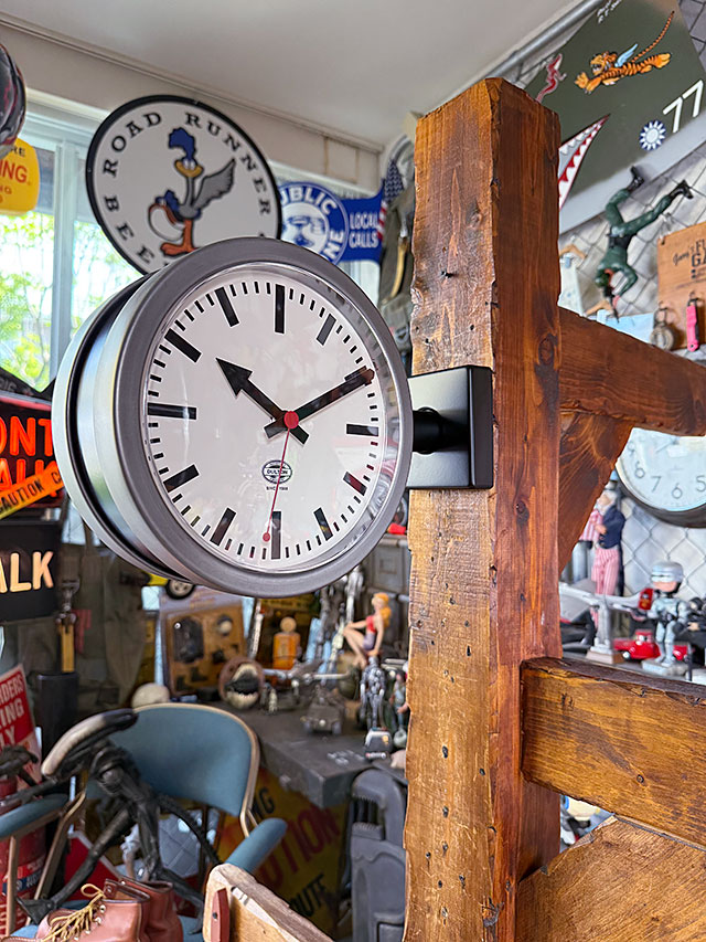 まるで外国の駅で見かけそうな・・・・そんな両面表示タイプのダブルフェイスクロックがダルトン社からリリースされました! こういうのって映画とかで見かけて憧れたりしませんでしたか? 装着した瞬間からそこが外国シーンになる・・・・そんな存在感の持ち主なんです。 付属の木ねじ&取り付けプレートで自宅の壁や柱に付けると、単なる時刻を知るための時計としてだけでなく、これ自体がシーンを彩るインテリアとして演出してくれるのがまさに魅力です。 実際に私も自宅のリビングに付けてますが、遊びに来る友達みーんな「この時計がオシャレだー」って言ってくれます。 それに向こう側からでもこっち側からでも時間がわかるので、実用面でもスゴク便利で使い勝手がイイのも使ってみて実感しました。 このSサイズは、先に発売されたLサイズだとどうしても大きすぎるので、もっと小さいサイズを発売して欲しいって声に応えてリリースされたものなんです。 販売開始からさっそく好評で、このサイズだとどんな部屋でも無理なく設置できちゃいますよ! ちなみに時計部分は磁石で引っ付ける仕組みなので、好きな角度で使えるのも設置の幅を広げてくれると評判イイんです。 たとえば少し斜めになった壁でも時計の向きを合わせれますからね! シーンの高い位置ってなかなか飾りつけることがないから、これだけでグッとイメージが変わりますよ! 「外国の駅」ってキーワードにピンと来たら、絶対オススメです! サイズ:横28.5cm×幅9cm×高さ20.5cm(約) 重量:1.5kg 電池:単三×2本 ・スウィープムーブメント(限りなく無音に近いムーブメントです) ・時計は磁石で引っ付いてるため好きな角度に調整可能 【知っておいて頂きたいこと】 ロウ(RAW)仕上げの製品について、クロムメッキやカラータイプとは異なり、金属の質感を見せるため、素地にクリア仕上げを施しております。 溶接痕や研磨跡、一部サビや擦れが見られる場合もございます。 また素地の色味や仕上がりの風合いに個体差が見られます。 ロウ(RAW)仕上げの特性として予めご了承ください。 類似商品はこちらダルトン ダブルフェイスクロック Sサイズ 12,100円ダルトン ダブルフェイスウォールクロック Lサ20,900円レッドリップ ウォールクロック 壁掛け時計 ア3,520円ダルトン ダブルフェイスクロック Sサイズ 12,100円ダルトン ダブルフェイスウォールクロック Lサ20,900円ダルトン ダブルフェイスウォールクロック Lサ20,900円オールドアメリカン グラスクロック アメリカ2,860円ダルトン ダブルフェイスクロック Sサイズ 12,100円オールドアメリカン グラスクロック アメリカ2,860円新着商品はこちら2026/1/14ファンコ ピンクパンサー ボビングヘッド ワッ4,180円2026/1/14スターウォーズ ストームトルーパー スタジャン22,000円2026/1/13ハンバーガー 灰皿 & 小物入れ ポリレジン 2,200円再入荷はこちら2026/1/13HANSON社 プラスチック ステンシルプレー2,090円2026/1/13チャンピオン コットンフロアマット アメリカン1,650円2026/1/13チャンピオン コットンマット 120cmロング2,750円2026/01/14 更新 ダルトン ダブルフェイスクロック Sサイズ (マットブラック/ロウ) 両面時計 アメリカン雑貨 アメリカ雑貨 グッズ モダン 壁掛け時計 おしゃれ かっこいい ショップインテリア アナログ時計 12,100 円