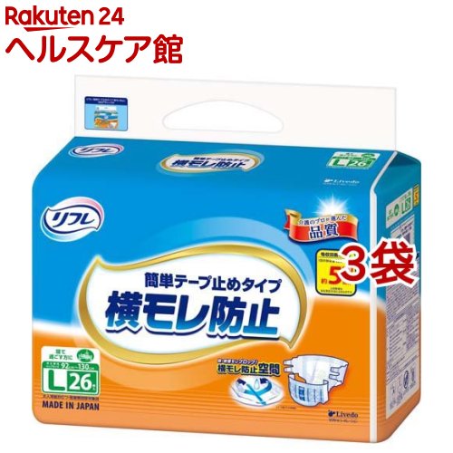 お店TOP>介護>おむつ・失禁対策・トイレ用品>介護用おむつ>介護用おむつテープタイプ Lサイズ>リフレ 簡単テープ止めタイプ 横モレ防止 L【リブドゥ】 (26枚入*3袋セット)【リフレ 簡単テープ止めタイプ 横モレ防止 L【リブドゥ】の商品詳細】●横モレ防止空間で 尿・軟便をしっかり受け止める!●モレを防ぐ吸収体形状で体とおむつの間に「横モレ防止空間」を形成し、尿や軟便があふれ出るのを防ぎます。 ●モレを防ぐギャザー:お腹まわりにフィットする前後のギャザーと足まわりの2つのギャザーで、尿や軟便のモレを防ぎます。 ●しっかりフィット、はずれにくい:長くて使いやすい「クロスフィット」テープが、すきまをつくらずモレを防ぎます。 ●体にあてやすいデザイン:両サイドのラインとセンターラインで、装着時の左右のズレを防ぎます。 ●おむつ内部のムレ防止:全面通気性シートで、おむつ内部の気になる湿気を外へ逃がします。 【使用方法】★あて方(横になった場合)(1)体を横向きにしておむつをおきます。 必ずテープのついている方を背中側にもってきます。 (2)パッド併用時は、中央部の緑色の部分を目安にしてパッドをおき、必ず立体ギャザーの内側に入れてください。 (3)体を戻しておむつの上にのせます。 背骨の位置と、おむつの中心が合うようにしてください。 (4)股ぐり部分は立体ギャザーを足の付け根に沿わせ、すきまができないように体にぴったりあてます。 そのあと前部をひっぱり上げます。 (5)テープは、股ぐり側を斜め上向きにつけ、次に腰まわり側を斜め下向きにつけてください。 前部幅広のテープの絵柄に合わせてつけるとフィット感が高まります。 (6)テープをつけたあとでウエストにぴったりしているか、股ぐりのギャザーが足の付け根に沿い、すきまがないかを確かめてください。 【規格概要】★医療費控除対象品★適用Lサイズ:ヒップサイズ92cm〜130cm(男女共用)★吸収回数の目安約5回分(1回の排尿量150mLとして)★素材表面材:ポリオレフィン系不織布吸水材:綿状パルプ/吸水紙/高分子吸水材防水剤:ポリオレフィン系フィルム止着剤:ポリエステル/ポリオレフィンなど伸縮剤:ポリウレタン糸結合剤:スチレン系エラストマーなど外装材:ポリエチレン★個装サイズ高さ315*巾485*奥行235(mm)★:品名:大人用紙おむつ【注意事項】・紙おむつ、包装袋は、誤飲のおそれがある幼児、ご老人のお手元に届かないようご配慮ください。 ・紙おむつを火に近づけると引火のおそれがあります。 ・紙おむつや肌が汚れているとカブレの原因になるので、こまめに交換し、清潔にしてください。 ・紙おむつの中の高分子吸収材(乾燥時:粒状/吸収時:ゼリー状)が出て、肌に付着した場合は濡れタオルで拭き取ってください。 ・誤って紙おむつの一部を食べてしまった場合は、早急に最寄の医師におみせください。 ・この製品は洗濯できません。 誤って洗濯すると中身が他の衣類に付着します。 その場合は、衣類を脱水してから、よくはたいてください。 洗濯機の内部はよく拭き取った後、水で洗い流してください。 ・紙おむつが肌に合わない場合には、ご使用を中止し、医師にご相談ください。 ★使用上の注意・汚れた紙おむつは早くとりかえてください。 ・テープは直接お肌につけないでください。 ・誤って口に入れたり、のどにつまらせることのないよう保管場所に注意し、使用後はすぐに処理してください。 ★保管上の注意・開封後はほこりや虫が入らないよう、衛生的に保管してください。 ★使用後の処理・紙おむつに付着した大便はトイレに始末してください。 ・汚れた部分を内側にして丸めて、不衛生にならないように処理してください。 ・トイレに紙おむつを捨てないでください。 ・使用後の紙おむつの廃棄方法はお住まいの地域のルールに従ってください。 ・外出時に使った紙おむつは持ち帰りましょう。 【ブランド】リフレ 簡単テープ止め【発売元、製造元、輸入元又は販売元】リブドゥコーポレーション※説明文は単品の内容です。 リニューアルに伴い、パッケージ・内容等予告なく変更する場合がございます。 予めご了承ください。 ・単品JAN:4904585021589リブドゥコーポレーション541-0048 大阪府大阪市中央区瓦町1-6-10 JPビル0120-271-361広告文責:楽天グループ株式会社電話:050-5577-5042[大人用紙おむつ 失禁用品/ブランド:リフレ 簡単テープ止め/] リフレ 簡単テープ止めタイプ 横モレ防止 L【リブドゥ】(26枚入*3袋セット)【リフレ 簡単テープ止め】 9,347 円
