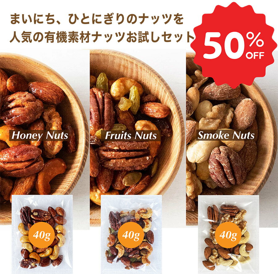 お試し ナッツ 小分け40g×3 無添加 砂糖不使用 糖質オフ 有機素材 ハニーナッツ フルーツナッツ スモークナッツ オーガニック くるみ アーモンド グラノーラ専門店 シリアル 朝食 おつまみ プチギフト お年賀 ギフト アサイーボウル 1,300 円