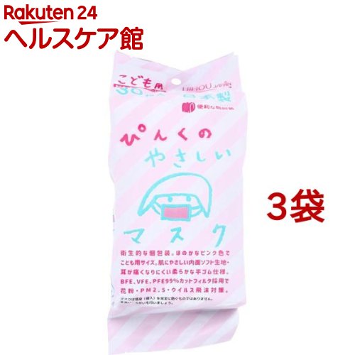 お店TOP>衛生医療>マスク>マスク全部>マスク全部>こども用 ぴんくのやさしいマスク 個包装 小学生サイズ (30枚入*3袋セット)【こども用 ぴんくのやさしいマスク 個包装 小学生サイズ の商品詳細】●学校やお出かけにも清潔な個包装。 ●ほのかなピンク色でこども用サイズ。 ●肌にやさしい内面ソフト生地・耳が痛くなりにくい柔らかな平ゴム仕様。 ●BFE、VFE、PFE 99%カットフィルタ採用で花粉・PM2.5・ウイルス飛沫対策。 ●肌あたりやさしい内面スーパーソフト生地。 ●お子様に安心の日本製。 ※マスクは感染(侵入)を完全に防ぐものではありません。 手洗い・うがいも行いましょう。 【使用方法】(1)プリーツをのばし、マスクを広げます。 ロゴマークが向かって右下にあるのが外側です。 (2)ノーズピースを上にして、紐を耳に掛けます。 (3)ノーズピースを鼻に合わせ、プリーツを顎まで覆う様にのばします。 【品名・名称】マスク【規格概要】【対象】風邪・花粉・ほこり・PM2.5等【サイズ】80*132mm【色調】ピンク【使用目的】本品は口と鼻を覆うように顔に取り付けることにより、花粉、ホコリなどの粒子の体内への侵入、咳やクシャミの飛沫が体内外に侵入、飛散することを抑えるためのマスクです。 このマスクは有害な粉塵やガス等が発生する場所でのご使用や、それを防ぐ目的には使用できません。 【素材】本体・フィルタ部:ポリプロピレンノーズピース:ポリエチレン耳ひも部:ナイロン、ポリウレタン【注意事項】・かゆみ、かぶれ、発疹など体に異常があった場合は直ちにご使用をお止めください。 ・においで気分が悪くなった場合は使用を中止してください。 ・汚れたらすぐ交換してください。 ・本品を変形、改造しないでください。 ・湿気のない清潔な所に保管してください。 ・乳幼児の手の届かないところに保管してください。 ・本品は医療分野用マスクとしては使用できません。 ・本品は使いきり商品です。 洗濯による再使用はできません。 ・本品は子供向けサイズです。 サイズが合わない方は大人用サイズをご利用ください。 ・マスクは感染(侵入)を完全に防ぐものではありません。 手洗い・うがいも行いましょう。 【原産国】日本【ブランド】美保(Bihou)【発売元、製造元、輸入元又は販売元】エスパック※説明文は単品の内容です。 リニューアルに伴い、パッケージ・内容等予告なく変更する場合がございます。 予めご了承ください。 ・単品JAN:4560114773208エスパック136-0071 東京都江東区亀戸2-24-3-205号0120-932-247広告文責:楽天グループ株式会社電話:050-5577-5043[マスク/ブランド:美保(Bihou)/] こども用 ぴんくのやさしいマスク 個包装 小学生サイズ (30枚入*3袋セット)【美保(Bihou)】 2,624 円