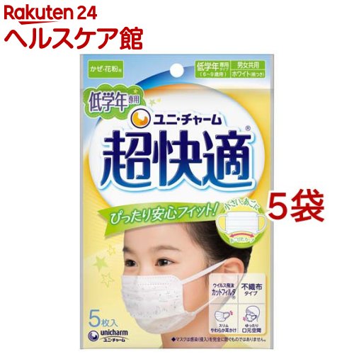 お店TOP>衛生医療>マスク>マスク 形状・素材別>立体マスク>超快適マスク低学年専用タイプ 不織布マスク (5枚入*5袋セット)お一人様10セットまで。 【超快適マスク低学年専用タイプ 不織布マスクの商品詳細】●低学年専用形状で、ぴったり安心フィット!●低学年専用ならではの、日本初あごぴたカーブが、低学年の小さいあごにずれずにフィット。 ●快適に着けられる工夫の、スリムやわらか耳かけとゆったり口元空間採用。 ●ウイルス飛沫カットフィルタで、空気中のウイルス飛沫・花粉の侵入をしっかりブロックします。 【使用方法】(1)表面のデザインを見てマスクの上下、表裏を確認します。 (2)耳かけを引っ張りながら、マスクを耳にかけます。 (3)「ノーズフィット」を鼻の形に合わせてフィットさせます。 プリーツの折り目を縦に伸ばして、鼻からあごまですっぽり隠れるように広げます。 サイズはあくまでも目安です。 個人差がありますので、サイズが大きいようであれば、「超快適マスク園児専用タイプ」を、小さいようであれば「超快適マスク小さめサイズ」をお使いください。 【規格概要】(素材)本体・フィルタ部:ポリオレフィン、ポリエステル、耳かけ部:ポリエステル・ポリウレタン、ノーズフィット部:ポリオレフィン、色調:白(包装材の材質)ポリプロピレン【注意事項】・個人差により、眼鏡が曇る場合がありますので、十分にご注意ください。 ・本品は使いきり商品です。 洗濯による再使用はできません。 ・耳かけを引っ張りすぎると、ゆるくなることがあります。 ・本品は有害な粉塵やガス等の発生する場所でのご使用はできません。 ・肌に異常がある場合は、使用しないでください。 ・万一、肌にかゆみ・かぶれ・しめつけや擦れによる異常があらわれた場合は、直ちにご使用をやめ、医師にご相談ください。 ・万一、臭いにより気分が悪くなった場合は、ご使用をおやめください。 ・乳幼児の手の届かない所に保管してください。 ・睡眠時のご使用は、安全性を考慮し、お控えください。 ・高温多湿な場所、直射日光の当たる場所での保管は避けてください。 ・火気のそばでのご使用はおやめください。 【原産国】中国【ブランド】超快適マスク【発売元、製造元、輸入元又は販売元】ユニ・チャーム※説明文は単品の内容です。 ※より多くの方に購入いただくために、複数回注文いただいた場合はキャンセルさせていただくことがございます。 リニューアルに伴い、パッケージ・内容等予告なく変更する場合がございます。 予めご了承ください。 ・単品JAN:4903111527588ユニ・チャーム東京都港区三田3-5-19住友不動産三田ガーデンタワー広告文責:楽天グループ株式会社電話:050-5577-5043[マスク/ブランド:超快適マスク/] 超快適マスク低学年専用タイプ 不織布マスク(5枚入*5袋セット)【超快適マスク】 1,463 円