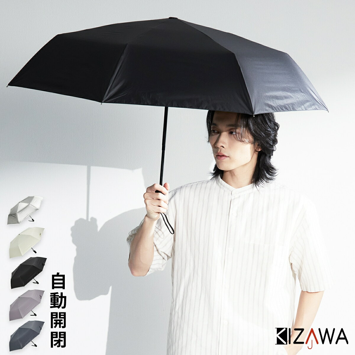 【自動開閉】開閉はボタンを押すだけのワンタッチオープン・クローズ。 荷物が多い時や車の乗り降り時など、軽く開閉ボタンを押すだけで開閉できますのでとても便利です。 柄を元に戻す際の不意な飛び出しを防ぐセーフティシャフト(日本特許取得済)搭載で、一般的な自動開閉折りたたみ傘より安全に閉じられます。 途中で手を放しても安全! 少ない力でシャフトを収縮できるので、男性はもちろん、女性やご年配の方でも操作しやすいのが嬉しいポイント!【完全遮光】日本繊維製品品質技術センターにおいて「遮光率100%」「UVカット率100%」「UPF50+」「遮熱効果」と証明された最高ランクを誇る高機能な生地を使用した完全遮光の日傘です。 上からのUV反射カット、裏側は地面や壁面からの照り返しからお肌や目への反射をカットします。 約17℃の温度上昇を抑えた遮熱効果は、木陰にいるような涼しさで外出も楽しくなります!【晴雨兼用】最高ランクの撥水性を誇るポリエステル繊維生地は、軽量・丈夫でありながら優れた撥水性能を持ち、晴雨兼用でご利用いただけます。 季節問わず使うことができ、梅雨対策にもUV対策にも欠かせない優秀なアイテム!【カラビナ・反射光】傘カバーにはブラックカラーのカラビナ付き!サッと引っかけることができるので、通勤・プライベート・アウトドアなどどんなシーンでも使い勝手抜群です。 持ち手のストラップにはライトに当たると反射光を放つ仕組みが施されています。 【選べるデザイン 男女兼用】どんなシーンにも合わせやすいブラック、オフ、グレー、スチールグレー、シルバーをご用意しました。 普段使い、ビジネスシーンなどニーズにあわせてご利用いただけます。 ■カラー:5色展開<サイズ>全長(開傘時):61cm全長(収納時):30cm親骨:58cm直径:97cm※測定方法によって誤差が生じます。 予めご了承下さい。 <重量>本体:約312g〜342g傘カバー(カラビナ含む):約24g〜26g※カラー・商品ごとに多少差異がございます。 予めご了承ください。 ※( )で表記されている数字はヌードサイズです。 ヌードサイズとは衣服を身につけない身体のサイズです。 お客様ご自身の身体サイズと比較してお選びください。 ■素材: 親骨:グラスファイバー、アルミ中棒:アルミ、スチール生地:ポリエステル ■お手入: >>商品のお取り扱い方法 ■原産国: 中国自動開閉 折りたたみ傘 晴雨兼用 日傘 雨傘 7本骨 58cm〜eagle+〜/KIZAWA(KIZAWA)シルバーオフホワイトグレースチーグレーブラック画面上と実物では、多少色具合が異なって見える場合がございます。