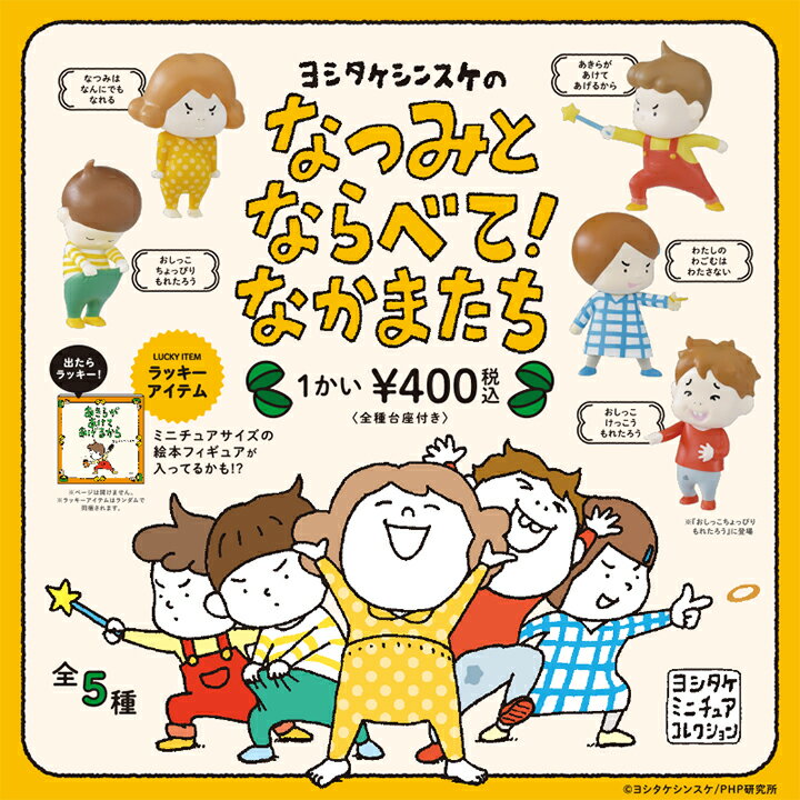 ネコポス配達 ポスト投函・荷物追跡可能・配達日時指定不可 ヨシタケシンスケのなつみとならべて!なかまたち 全5種セット + ラッキーアイテム イラストレーター&絵本作家・ヨシタケシンスケの絵本に出てくるユーモアたっぷりな キャラクターたちが 手のひらサイズのフィギュアに! 【ラインナップ】 ・なつみちゃん ・おしっこちょっぴりもれたろう ・おしっこけっこうもれたろう ・わごむちゃん ・あきらくん +ラッキーアイテム ミニチュアサイズの絵本フィギュア (必ず付属します) ※カプセルは付属しません。