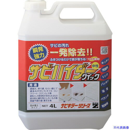 オレンジブック トラスコ中山 TRUSCOBANーZI 除錆剤 サビハイダークイック(詰め替え用 )4L クリア 〔品番:CSHDCRL40K〕[ 注番:3700154]特長●水性で中性タイプの錆に直接塗って錆を落とします。 ●下地を痛めないので、車のボディシャンプーとしても使用出来ます。 ●鉄粉除去にも使用でき、下地が曇りません。 仕様●色:クリア●容量(ml):4000●容量(L):4●容量(g):4000●容量(kg):4●容器タイプ:プラスチック容器●摘要:サビ除去●幅(mm):195●奥行(mm):110●高さ(mm):267仕様2●液性:中性●素材:◎鉄・ステンレス・プラスチック・コンクリート、○アルミニウム、△ゴム・大理石・布製品・メッキ製品、×高炭素鋼・焼入れ鋼・木材●塗装環境:温度5℃以上(湿度85%以下)●詰替材質/仕上●チオグリコール酸アンモニウム、界面活性剤セット内容/付属品注意原産国(名称)日本JANコード4562375770415本体質量4430gオレンジブック トラスコ中山 TRUSCOBANーZI 除錆剤 サビハイダークイック(詰め替え用 )4L クリア 〔品番:CSHDCRL40K〕[注番:3700154][本体質量:4430g]《包装時基本サイズ:290×205×130》〔包装時質量:5kg〕分類》化学製品》化学製品》サビ取り剤☆納期情報:仕入れ先通常在庫品 (欠品の場合有り) ■BANーZI 除錆剤 サビハイダークイック(詰め替え用 )4L クリア CSHDCRL40K(3700154) 17,336 円