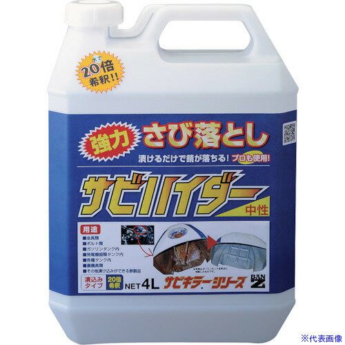 オレンジブック トラスコ中山 TRUSCOBANーZI 除錆剤 サビハイダー 4L クリア 〔品番:CSHDL40K〕[ 注番:3701709]特長●漬け込むだけで簡単に錆を落とします。 ●水性で中性ですので安全で20倍に希釈して使用できます。 ●ガソリンタンクや部品の錆落としが擦らずにでき簡単です。 仕様●色:クリア●容量(ml):4000●容量(L):4●容器タイプ:プラスチック容器●摘要:サビ除去●幅(mm):195●奥行(mm):110●高さ(mm):267仕様2●塗装方法:漬け込み●塗装環境:5℃以上(湿度85%以下)●注入希釈(水希釈率):本品200ml:水3.8L※水で20倍(5%希釈)●漬け込み時間:5〜6時間(水の代わりに40〜60℃程度のお湯を使用すると効果的)材質/仕上●有機酸アミン塩、安定化剤セット内容/付属品注意原産国(名称)日本JANコード4562375770316本体質量4850gオレンジブック トラスコ中山 TRUSCOBANーZI 除錆剤 サビハイダー 4L クリア 〔品番:CSHDL40K〕[注番:3701709][本体質量:4850g]《包装時基本サイズ:290×205×130》〔包装時質量:5kg〕分類》化学製品》化学製品》サビ取り剤☆納期情報:仕入れ先通常在庫品 (欠品の場合有り) ■BANーZI 除錆剤 サビハイダー 4L クリア CSHDL40K(3701709) 17,369 円