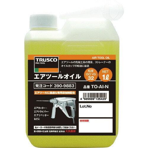 オレンジブック トラスコ中山 TRUSCOTRUSCO エアーツールオイル 1L 〔品番:TOAIN〕[ 注番:3909883]特長●良質のベースオイルに各種添加剤を配合したエアツール専用オイルです。 ●エアツールに最適な専用添加剤を配合しています。 用途●エアタッカー・エアドライバー・エアリベッターなど空圧工具の潤滑。 ●ストレーナーのオイルカップの給油。 仕様●色:淡黄●容量(L):1●容量(ml):1000●粘度グレード:ISO VG32仕様2●JIS規格品:JIS区分なし●容器:1Lボトル●原液量:1L●鉱油の種類:高度精製油材質/仕上●主成分:潤滑基油セット内容/付属品●注入ノズル注意●危険物の品目:第4石油類●危険物の類別:第4類●危険等級:3●危険物の数量(L):1●提供不可:ミルシート原産国(名称)日本JANコード4989999125429本体質量975gオレンジブック トラスコ中山 TRUSCOTRUSCO エアーツールオイル 1L 〔品番:TOAIN〕[注番:3909883][本体質量:975g]《包装時基本サイズ:123×65×205》〔包装時質量:950g〕分類》化学製品》化学製品》潤滑油☆納期情報:仕入れ先通常在庫品 (欠品の場合有り) ■TRUSCO エアーツールオイル 1L TOAIN(3909883) 1,166 円