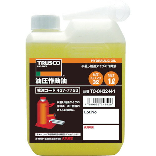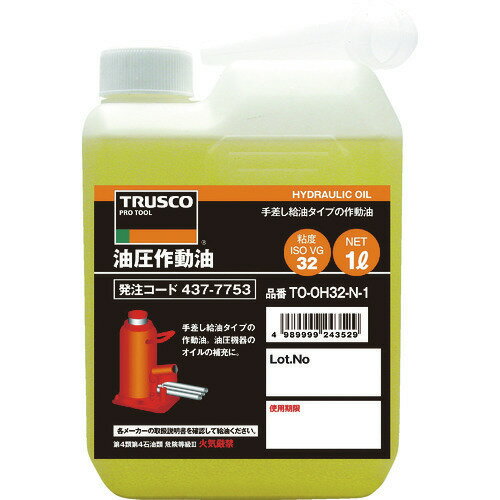 オレンジブック トラスコ中山 TRUSCOTRUSCO 油圧作動オイル VG46 1L 〔品番:TOOH46N1〕[ 注番:4377761]特長●高精度に精製した鉱物油ベースの油圧作動オイルです。 用途●各種油圧機器の作動油として、補充用に。 仕様●色:淡黄●容量(L):1●容量(ml):1000●粘度グレード:ISO VG46仕様2●使用温度範囲:150℃以下●JIS規格品:JIS区分なし●鉱油の種類:高度精製油材質/仕上●主成分:潤滑基油セット内容/付属品●注入ノズル注意●危険物の品目:第4石油類●危険物の類別:第4類●危険等級:3●危険物の数量(L):1●提供不可:ミルシート原産国(名称)日本JANコード4989999243536本体質量980gオレンジブック トラスコ中山 TRUSCOTRUSCO 油圧作動オイル VG46 1L 〔品番:TOOH46N1〕[注番:4377761][本体質量:980g]《包装時基本サイズ:65×125×205》〔包装時質量:950g〕分類》化学製品》化学製品》潤滑油☆納期情報:仕入れ先通常在庫品 (欠品の場合有り) ■TRUSCO 油圧作動オイル VG46 1L TOOH46N1(4377761) 1,595 円