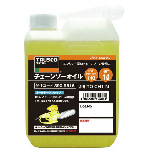 オレンジブック トラスコ中山 TRUSCOTRUSCO チェーンソーオイル1L 〔品番:TOCHN1〕[ 注番:3909816]特長●チェーンソーに高い付着性を持つ、夏冬通じて使用できる専用オイルです。 用途●チェーンソー・バーの潤滑に。 仕様●色:褐色●容量(L):1●容量(ml):1000●粘度:110仕様2●JIS規格品:JIS区分なし●容器:1Lボトル●原液量:1L●鉱油の種類:高度精製油材質/仕上●主成分:潤滑油基油セット内容/付属品注意●危険物の品目:第4石油類●危険物の類別:第4類●危険等級:3●危険物の数量(L):1●提供不可:ミルシート原産国(名称)日本JANコード4989999125351本体質量0.89kgオレンジブック トラスコ中山 TRUSCOTRUSCO チェーンソーオイル1L 〔品番:TOCHN1〕[注番:3909816][本体質量:0.89kg]《包装時基本サイズ:65×125×205》〔包装時質量:930g〕分類》化学製品》化学製品》潤滑油☆納期情報:仕入れ先通常在庫品 (欠品の場合有り) ■TRUSCO チェーンソーオイル1L TOCHN1(3909816) 1,386 円