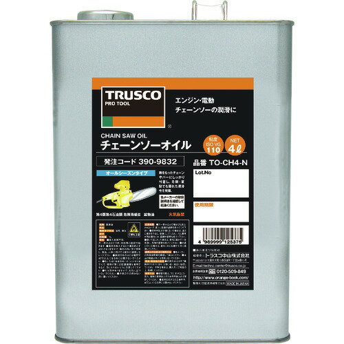 オレンジブック トラスコ中山 TRUSCOTRUSCO チェーンソーオイル4L 〔品番:TOCHN4〕[ 注番:3909832]特長●チェーンソーに高い付着性を持つ、夏冬通じて使用できる専用オイルです。 用途●チェーンソー・バーの潤滑に。 仕様●色:褐色●容量(L):4●容量(ml):4000●粘度:110仕様2●JIS規格品:JIS区分なし●容器:4Lボトル●原液量:4L●鉱油の種類:高度精製油材質/仕上●主成分:潤滑油基油セット内容/付属品注意●危険物の品目:第4石油類●危険物の類別:第4類●危険等級:3●危険物の数量(L):4●提供不可:ミルシート原産国(名称)日本JANコード4989999125375本体質量3.56kgオレンジブック トラスコ中山 TRUSCOTRUSCO チェーンソーオイル4L 〔品番:TOCHN4〕[注番:3909832][本体質量:3.56kg]《包装時基本サイズ:110×280×240》〔包装時質量:3860g〕分類》化学製品》化学製品》潤滑油☆納期情報:仕入れ先通常在庫品 (欠品の場合有り) ■TRUSCO チェーンソーオイル4L TOCHN4(3909832) 3,421 円