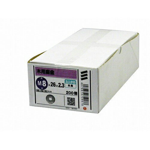 外形の特に大きな座金です。 ボルト、ナットなどで締結する際の面圧の分散に、相手部材の傷防止、下穴が大きい場合の陥没防止等に使用します。 生地に比べ耐食性があります。 内径に対し外径の比率が大きい平座金です。 座面が広いので、木材のように軟らかい部材に適しています。 呼び径は使用するおねじの径でワッシャーの内径は若干大きめの穴が開いています。 構成数:200。 鉄(ユニクロめっき)。 サイズ:M8×26×2.3mm。 ※商品画像は一例です。 多少形状が異なる場合がございますのでご了承ください。 イメージ違い、注文間違い等お客様都合と判断される商品の交換、返品は承りかねます。