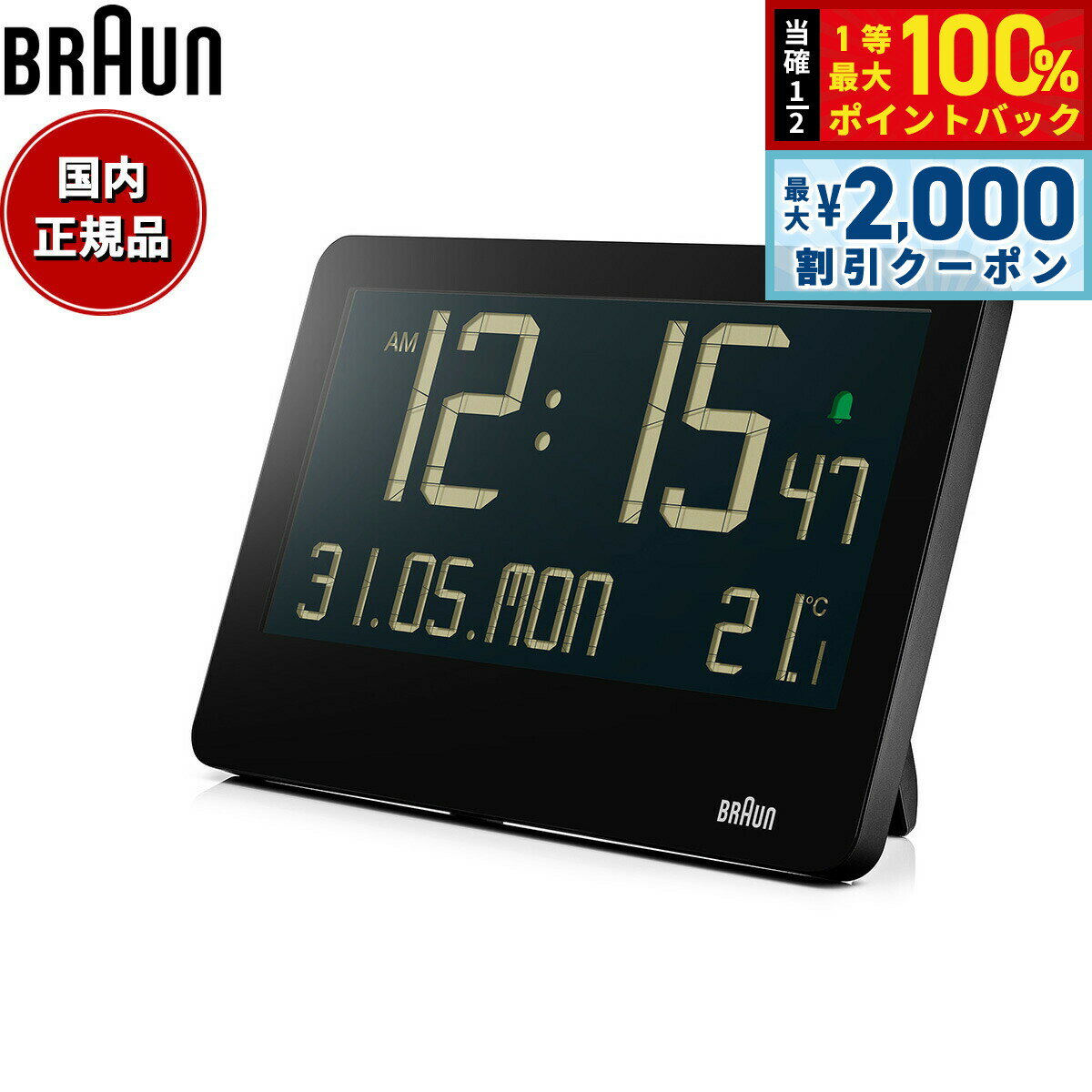 伝統と革新を継承するBRAUNデジタルクロックBC14は、幅26cm、高さ17cmある視認性抜群の大型LCDディスプレイで、壁掛け・置きの2WAY対応なのも魅力の一つです。 12時間表示/24時間表示の切り替えが可能な時刻表示をメインに、日付、曜日に加え、室内温度も表示します。 大きな画面で視認性が高く、壁に掛けた時に遠くからでもはっきりと表示を認識することができます。 壁に掛ける際は時計背面の穴にフックを引っ掛けることで簡単に掛けることが可能です。 背面には折り畳み式のバックスタンドが付いているので置き時計としても使用することができ、アラーム機能も備えています。 遠くからでも見やすいので、オフィスやホテル、レストランのエントランスなど多くの人の目につく場所での使用もおすすめです。 商品名BRAUN ブラウン デジタル クロック BC14B 置き時計 掛け時計 Digital Clock 261mm ブラック商品番号BC14Bブランドブラウン BRAUNムーブメントクォーツ アラーム日付表示室内温度表示12 or 24時間表示単三電池2本で作動※ご使用環境により液晶が暗く感じられることがございます。 何卒ご了承下さい。 ※電池をお使いいただく際に「充電式(1.2V)」では、電圧不足のため不具合が生じる場合がございます。 市販されております乾電池をご使用下さい。 風防素材プラスチックケース素材プラスチックケースサイズ173×261mmケース厚24mm文字盤カラーブラック本体重量520g保証期間メーカー1年間保証付属保証カード / 専用BOXBRAUN ブラウン デジタル クロック BC14B 置き時計 掛け時計 Digital Clock 261mm ブラック伝統と革新を継承するBRAUNデジタルクロックBC14は、幅26cm、高さ17cmある視認性抜群の大型LCDディスプレイで、壁掛け・置きの2WAY対応なのも魅力の一つです。 12時間表示/24時間表示の切り替えが可能な時刻表示をメインに、日付、曜日に加え、室内温度も表示します。 大きな画面で視認性が高く、壁に掛けた時に遠くからでもはっきりと表示を認識することができます。 壁に掛ける際は時計背面の穴にフックを引っ掛けることで簡単に掛けることが可能です。 背面には折り畳み式のバックスタンドが付いているので置き時計としても使用することができ、アラーム機能も備えています。 遠くからでも見やすいので、オフィスやホテル、レストランのエントランスなど多くの人の目につく場所での使用もおすすめです。