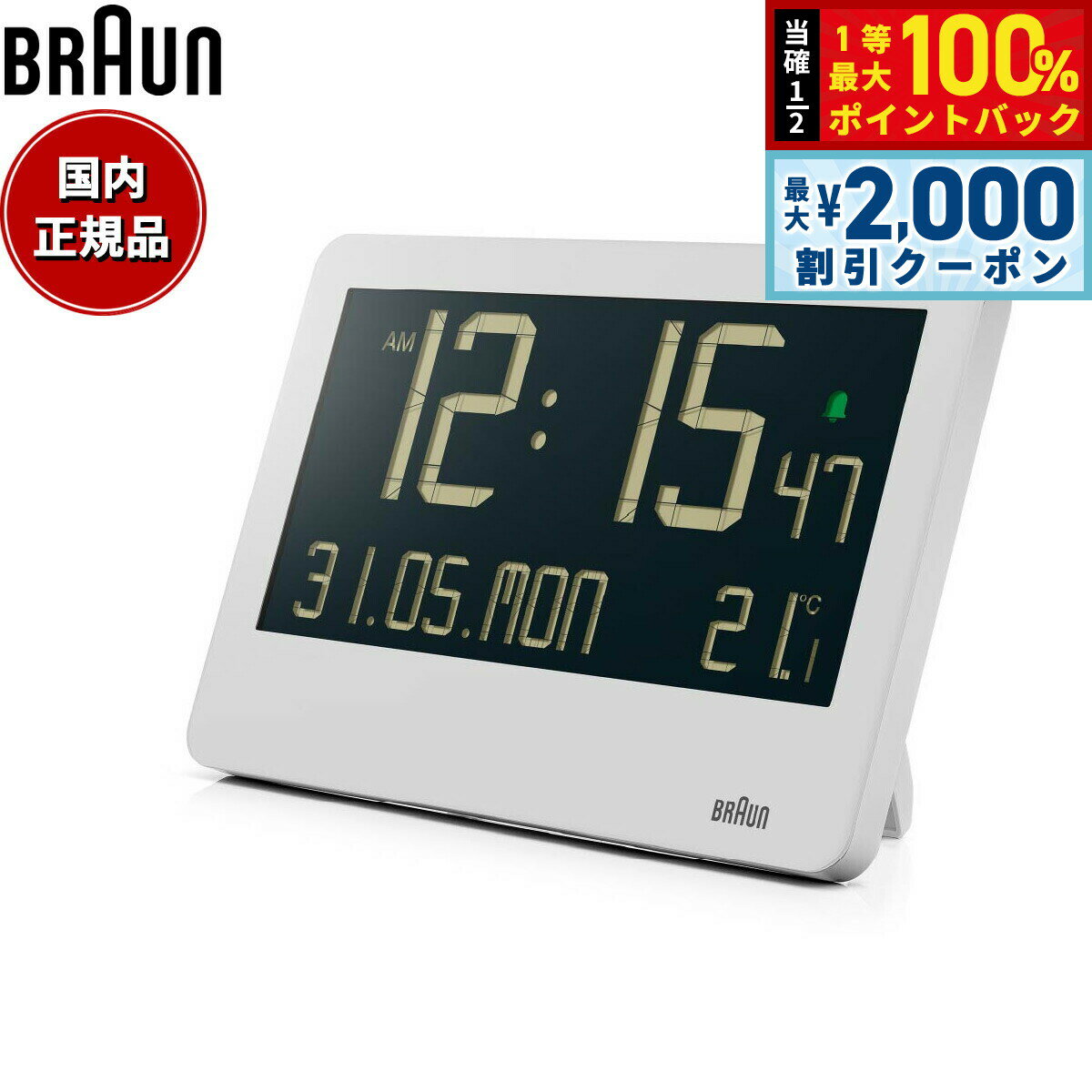 伝統と革新を継承するBRAUNデジタルクロックBC14は、幅26cm、高さ17cmある視認性抜群の大型LCDディスプレイで、壁掛け・置きの2WAY対応なのも魅力の一つです。 12時間表示/24時間表示の切り替えが可能な時刻表示をメインに、日付、曜日に加え、室内温度も表示します。 大きな画面で視認性が高く、壁に掛けた時に遠くからでもはっきりと表示を認識することができます。 壁に掛ける際は時計背面の穴にフックを引っ掛けることで簡単に掛けることが可能です。 背面には折り畳み式のバックスタンドが付いているので置き時計としても使用することができ、アラーム機能も備えています。 遠くからでも見やすいので、オフィスやホテル、レストランのエントランスなど多くの人の目につく場所での使用もおすすめです。 商品名BRAUN ブラウン デジタル クロック BC14W 置き時計 掛け時計 Digital Clock 261mm ホワイト商品番号BC14Wブランドブラウン BRAUNムーブメントクォーツ アラーム日付表示室内温度表示12 or 24時間表示単三電池2本で作動※ご使用環境により液晶が暗く感じられることがございます。 何卒ご了承下さい。 ※電池をお使いいただく際に「充電式(1.2V)」では、電圧不足のため不具合が生じる場合がございます。 市販されております乾電池をご使用下さい。 風防素材プラスチックケース素材プラスチックケースサイズ173×261mmケース厚24mm文字盤カラーホワイト本体重量520g保証期間メーカー1年間保証付属保証カード / 専用BOXBRAUN ブラウン デジタル クロック BC14W 置き時計 掛け時計 Digital Clock 261mm ホワイト伝統と革新を継承するBRAUNデジタルクロックBC14は、幅26cm、高さ17cmある視認性抜群の大型LCDディスプレイで、壁掛け・置きの2WAY対応なのも魅力の一つです。 12時間表示/24時間表示の切り替えが可能な時刻表示をメインに、日付、曜日に加え、室内温度も表示します。 大きな画面で視認性が高く、壁に掛けた時に遠くからでもはっきりと表示を認識することができます。 壁に掛ける際は時計背面の穴にフックを引っ掛けることで簡単に掛けることが可能です。 背面には折り畳み式のバックスタンドが付いているので置き時計としても使用することができ、アラーム機能も備えています。 遠くからでも見やすいので、オフィスやホテル、レストランのエントランスなど多くの人の目につく場所での使用もおすすめです。
