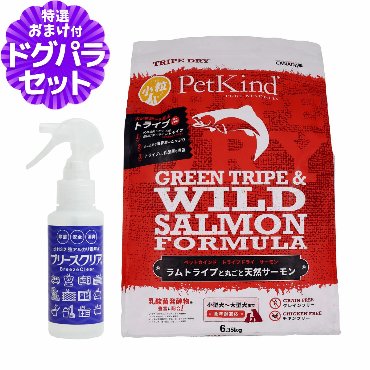ペットカインド トライプドライの解説 トライプファースト&グレインフリーの総合栄養食。 愛犬の健康のためにトライプを第一主原料に使用。 さらに、ナチュラルフード、ヒューマングレード、グレインフリーにこだわり肉食の愛犬の本来の食事に配慮しました。 トライプの豊富な栄養素をあなたの愛犬にダイレクトに届けるために、新鮮なグリーントライプにこだわりました。 PetKindでは第一胃から第四胃まですべてを原料に採用しています。 すべての胃を使うことに意味があるのです。 ペットカインド トライプドライ グリーントライプ&ワイルドサーモンの詳細 対象 全犬種・全年齢適応 グリーントライプ&ワイルドサーモンについて グリーンラムトライプを第一主原料に、新鮮なワイルドサーモンを贅沢に使用しました。 サーモンにはアスタキサンチン等が豊富に含まれます。 魚好きな愛犬が飛んでくる美味しさです。 ・つやつやな被毛、健康的な筋肉や体型作りに! ・腸の健康を維持し、元気なお腹へ! ・食い飽き・食いムラ・ご飯を食べないお悩みを解消。 ・「一番食べたい部位」だから喜んで食べてくれる高嗜好性。 ・グリーントライプにはアミノ酸や必須脂肪酸が豊富、第一胃から第四胃まですべてを原料に採用。 ・遺伝子組み換えや農薬、残留化学物質のない「新鮮で安全な食材」を使用。 ・合成保存料や人工香料・着色料は一切使用していません。 ・安心のカナダメイド。 ・丈夫な体づくりのために、子犬のころからグリーントライプを与えることをおすすめします。 その他 ※直射日光を避け、涼しく乾燥した場所で保管してください。 ※当店の商品は全て正規品です。 安心してお買い求めください。 ■パッケージ・内容成分などは予告なく変更になることがございます。 ご了承くださいませ。 犬/ドッグ/ドック/フード/グレインフリー/穀物不使用/羊/オメガ3/オメガ6/ペット/PetKind/TripeDry原材料 ラムトライプ、サーモン、エンドウ豆、エンドウ豆澱粉、七面鳥ミール、エンドウ豆タンパク、キャノーラオイル(ローズマリー抽出物による保存処理)、亜麻仁、ナチュラルフレーバー、キノア、カボチャ、ホウレンソウ、ニンジン、ブロッコリー、クランベリー、りんご、ブルーベリー、バナナ、炭酸カルシウム、塩化ナトリウム、リン酸二カルシウム、塩化カリウム、、サーモンオイル(混合トコフェロールによる保存処理)、チコリ根、塩化コリン、ビタミン(ビタミンA、ビタミン D3、ビタミンE、ナイアシン、パントテン酸カルシウム、リボフラビン、硝酸チアミン、塩化ピリドキシン、葉酸、ビタミン B12) 、ミネラル(硫酸亜鉛、硫酸鉄、亜鉛タンパク化合物、鉄タンパク化合物、硫酸銅、酸化マンガン、銅タンパク化合物、マンガンタンパク化合物、ヨウ素酸カルシウム、亜セレン酸ナトリウム)、タウリン、乾燥ラクトバチルス・アシドフィラス発酵物、乾燥ラクトバチルス・カゼイ発酵物、乾燥ビフィズス菌ビフィダム・サーモフィラム発酵物、乾燥ストレプトコッカス・フェシウム発酵物、ユッカシジケラ、ローズマリー、トウガラシ、ペパーミント、タイム、緑茶抽出物 保証成分 粗タンパク質: 30.0% 以上、粗脂質: 16.0% 以上、粗繊維質: 4.0% 以下、水分:10.0% 以下、粗灰分:7.0% 以下、リン:0.8%以上、マグネシウム:0.10%以下、タウリン:2790mg/kg以上、オメガ 6 : 2.3% 以上、オメガ 3 : 1.5% 以上 カロリー 359.6Kcal/100g 原産国 カナダ 対象年齢 全犬種・全年齢適応 給与量目安 ※愛犬が常に新鮮な水を飲めるように配慮してください。 ご注意 ※直射日光を避け、涼しく乾燥した場所で保管してください。 商品についてのお知らせ ※パッケージ・内容成分などは予告なく変更になることがございます。 おすすめポイント ペットカインド トライプドライ グリーントライプ&ワイルドサーモン 6.35kg+ph13.2強アルカリ電解水100ml 子犬 成犬 シニア犬 グレインフリー 穀物不使用 13,750 円