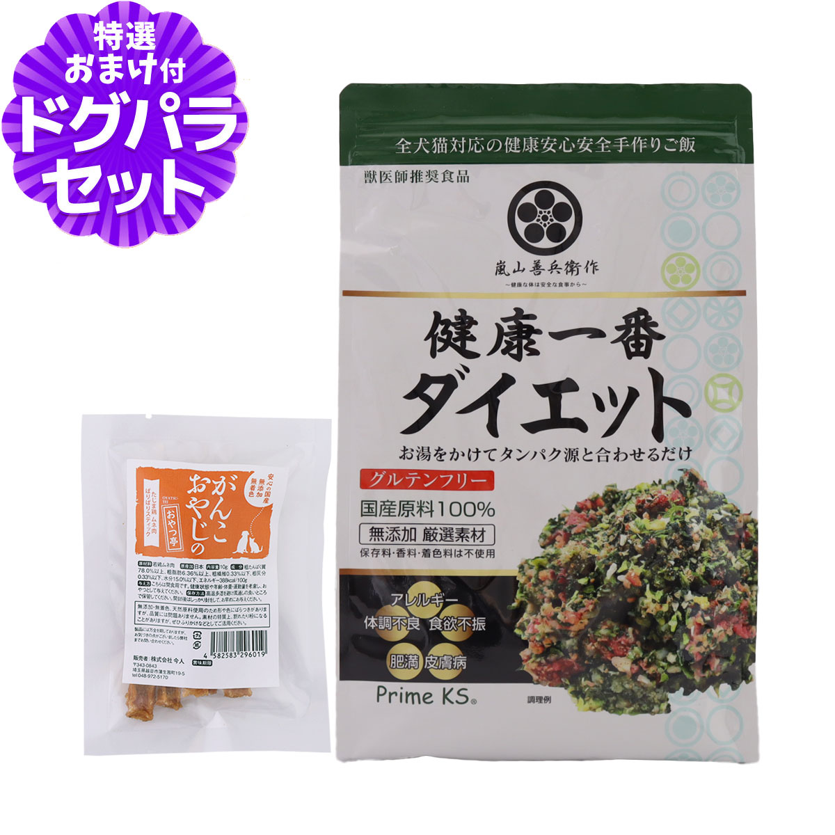 プライムケイズ 嵐山善兵衛作 健康一番 ダイエットの解説プライムケイズ 嵐山善兵衛作 健康一番はお湯を注ぐだけの簡単手作りご飯の素。 アレルギー・皮膚病・ダイエットでお悩みの方、健康な毎日を過ごさせてあげたいという皆様の我が子を思う気持ちを形にしました。 食材はすべてトレサビリティーのわかる安心で安全なものしか使用せず、無添加で安心です。 サプリメント入りで健康をサポート。 しっかり食べても低カロリー。 プライムケイズ 嵐山善兵衛作 健康一番 ダイエットの詳細対象肥満犬用(人間もペットも食べられます)プライムケイズ 嵐山善兵衛作 健康一番 ダイエットについて・お野菜がたっぷりだからしっかり食べてもカロリー控えめ。 ・生活習慣病・肥満や皮膚病などの疾患予防になります。 ・獣医師特定推薦食品。 ・穀類・野菜も国産のすべてトレサビリティー(生産履歴)のわかる安心安全なもののみ使用。 その他※当店の商品は全て正規品です。 安心してお買い求めください。 プライムケイズ/健康一番/ダイエット/嵐山善兵衛作/国産/無添加/トッピング/手作り商品特長 原材料 キャベツ(国内産)、小松菜(国内産)、高菜(国内産)、人参(国内産)、かぼちゃ(国内産)、ごぼう(国内産)、えごま(国内産)、れんこん(国内産)、紫芋(国内産)、きな粉(遺伝子組み換えでない)(国内産)、ほうれん草(国内産)、昆布・澱粉・無臭ニンニク(国内産)、カツオ(国内産)、いわし(国内産)、ひじき(国内産)、わかめ(国内産)、うなぎの骨(国内産)、まぐろ肉・骨(国内産)、植物抽出酵素{米ぬか、ふすま、おから、大麦} 、ハーブ(ジンジャー・シルバーバイン・ヨブスディアス)、ビール酵母 ※原材料に使用している「無臭ニンニク」はペットが食しても問題ございません。 ご安心してお使いください。 保証成分 たんぱく質 15.2g, 炭水化物 69.2g, 脂質 3.8g, 灰分 4.4g, 水分 7.4g, カルシウム 620mg, リン 350mg, ナトリウム 95mg カロリー(100gあたり) 372kcal 原産国 日本 対象年齢 子犬から高齢犬まで 子猫から高齢猫まで 給与量目安 ・1日2食の子は、1日の給与量の半分を1食に与えて下さい。 ・1日1食の子は、1日の給与量の3分の2ぐらいにし、おやつで補ってください。 ・その子の生活環境・年齢などにより給与量は変わります。 その子に応じて量を調整してあげて下さい。 ・タンパク源によりカロリーが変わりますので量を調整して下さい。 ・大型犬の場合、1日1食では胃腸に負担がかかるため、1日2食にして下さい。 商品についてのお知らせ ※パッケージ・内容成分などは予告なく変更になることがございます。 おすすめポイント プライムケイズ 嵐山善兵衛作 健康一番 ダイエット 460g+国産たじま鶏ジャーキー(小サイズ) 4,268 円
