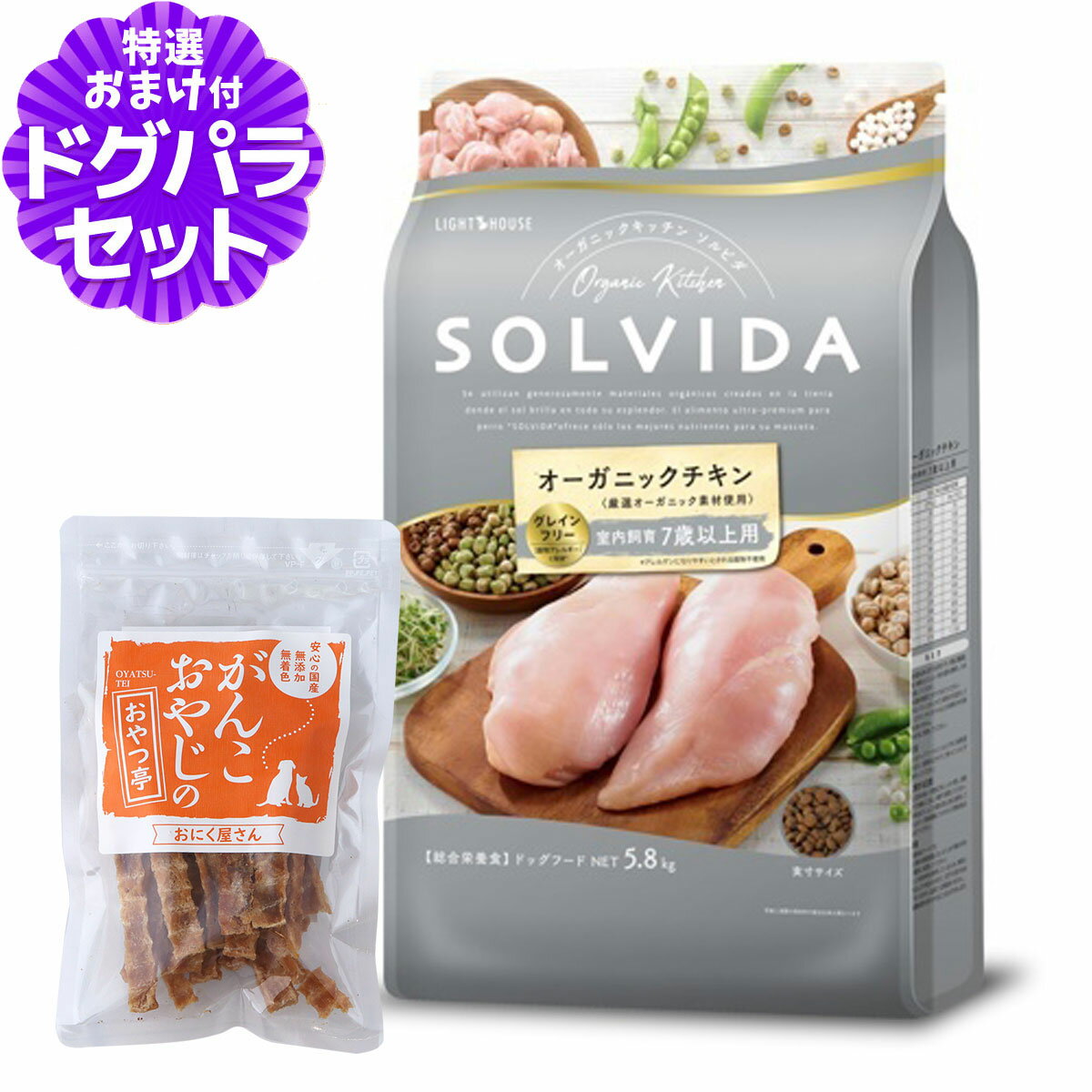 SOLVIDA ソルビダ グレインフリーチキン 室内飼育7歳以上用の解説 『人の赤ちゃん基準の安心素材』愛犬にも「人と同じ基準」の食材を。 食品添加物や農薬などを使わない安全性にこだわった原材料のみを使用し、安心して与え続けられるプレミアムドッグフードをお届けします。 『理想的な栄養バランス』20種類以上の厳選された原材料を、最新のペット栄養学に基づいて、ワンちゃんに理想的な栄養バランスで配合しています。 『極めて高い嗜好性』安全で栄養バランスに優れていても「おいしくない」食事ではストレスで逆効果。 ワンちゃんが喜んで食べる「食いつき」にもこだわりました。 ソルビダ グレインフリーチキン 室内飼育7歳以上用の詳細 対象 全犬種・室内飼育7歳以上シニア犬用 ソルビダ グレインフリーチキン 室内飼育7歳以上用について いつまでも健康で長生きしてほしいから。 シニア犬の健康を深く追求した7歳以上用ソルビダは、抗酸化食材をふんだんに使い、消化吸収の良い動物性たんぱく質を主原料として、おいしさはそのままに成犬用に比べカロリーと脂質を抑えました。 さらにアレルギーに配慮し、穀物類は一切使用しておりませんので、腸に負担をかけることなく消化ができます。 また、ユッカシジゲラ抽出物を配合することで、体臭や便臭の軽減をサポートします。 ・消化吸収に優れた良質のたんぱく源が主原料。 衰えやすい筋肉の維持にも配慮。 ・加齢に伴い低下する基礎代謝を考慮し、脂質とカロリーを控えめ。 ・抗酸化物質を豊富に含む食材をふんだんに使用。 ・食物アレルギー、穀物類の消化が苦手な愛犬に配慮したグレインフリー(穀物不使用)。 ・穀物の代わりに栄養価が高く消化に優れた豆類を使用。 ・自然の中でのびのび育ったオーガニックチキンをたんぱく源のベースとして使用し、オーガニック野菜やフルーツをバランスよく配合。 ・USDA(米国農務省)の厳しいオーガニック基準をクリア。 ・AAFCO栄養基準(総合栄養食) その他 直射日光を避け、風通しの良い場所に保管してください。 ※当店の商品は全て正規品です。 安心してお買い求めください。 ■パッケージ・内容成分などは予告なく変更になることがございます。 ご了承くださいませ。 ソルビダ/インドア/室内犬/シニア/チキン/グレインフリー/ドッグフード原材料 オーガニックチキン生肉、乾燥チキン、オーガニック乾燥豆類、オーガニックエンドウ豆粉、オーガニック乾燥ヒヨコ豆、オーガニックタピオカ粉、オーガニック乾燥アルファルファ、オーガニック挽き割りフラックスシード、天然フレーバー、鶏脂肪*、乾燥サーモン、オーガニック乾燥ジャガイモ、エンドウ豆でんぷん、乾燥トマト繊維、オーガニック乾燥ケルプ、オーガニック乾燥リンゴ繊維、オーガニックひまわり油*、乾燥ビール酵母、サーモンオイル*、チキン軟骨(グルコサミン、コンドロイチン源)、タウリン、オーガニックひまわりの種、乾燥かぼちゃ、乾燥ブルーベリー、オーガニック乾燥にんじん、乾燥ブロッコリー、加水分解酵母(マンナンオリゴ糖源)、オーガニック乾燥クランベリー、乾燥チコリ根(イヌリン、フラクトオリゴ糖源)、乾燥セージ、乳酸、ユッカフォーム抽出物、ガーリックパウダー、ミネラル類(プロテイネイテッド亜鉛、プロテイネイテッド鉄、プロテイネイテッド銅、プロテイネイテッドマンガン、食塩、ヨウ素酸カルシウム、セレニウム酵母、塩化カリウム)、ビタミン類(塩化コリン、ビタミンE補助食品、ナイアシン補助食品、ビタミンB1硝酸塩、D-パントテン酸カルシウム、ビタミンA補助食品、ビタミンB6、リボフラビン補助食品、ビタミンD3補助食品、ビオチン、ビタミンB12補助食品、葉酸)、プロバイオティクス微生物(イースト菌、乳酸菌、麹菌、糸状菌、枯草菌)、酸化防止剤(ミックストコフェロール) *ミックストコフェロールで保存 保証成分 たんぱく質23%以上、脂質10%以上、粗繊維6%以下、粗灰分8%以下、水分10%以下、カリウム1.0%、ナトリウム0.2%、セレニウム酵母0.35mg/kg以上、ビタミンA 5,000 IU/kg以上、ビタミンE 50 IU/kg以上、オメガ6脂肪酸2.0%以上、オメガ3脂肪酸1.25%以上、リン1.0% カロリー 330kcal/100g 原産国 アメリカ 対象年齢 室内飼育7歳以上シニア犬用 給与量目安 上記の給与量はあくまでも目安です。 ペットの犬種、運動量、健康状態、体重などによって、給与量を調節し、与えすぎに注意してください。 ・1日の給与量を数回に分けて与えてください。 ・ソルビダは、バランスのとれた栄養分を配合しております。 ビタミンやミネラルなどの栄養分を添加する必要はありません。 ・常に新鮮な水を用意してください。 ソルビダ グレインフリーへの切り替えに際してのお願い 穀物入りのフードからグレインフリー(穀物不使用)フードへ切り替える場合、腸内の消化酵素の準備が整うまで、便がゆるくなる場合がございます。 ワンちゃんの胃腸に負担がかからないよう、少量を従来のフードに混ぜて
