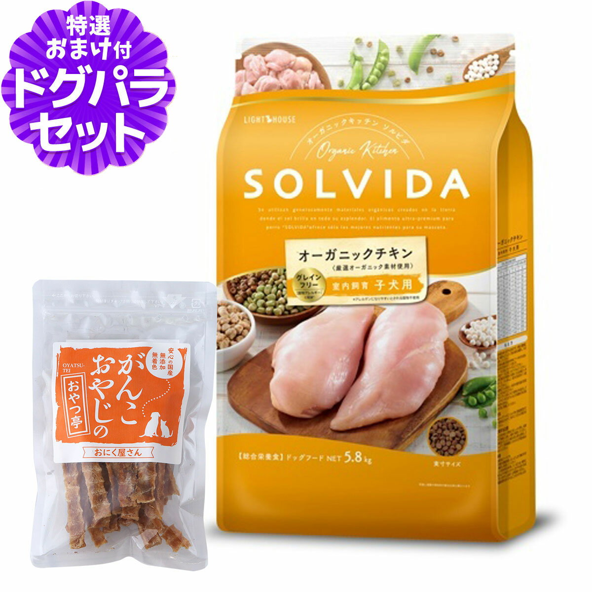 SOLVIDA ソルビダ グレインフリーチキン 室内飼育子犬用の解説 『人の赤ちゃん基準の安心素材』愛犬にも「人と同じ基準」の食材を。 食品添加物や農薬などを使わない安全性にこだわった原材料のみを使用し、安心して与え続けられるプレミアムドッグフードをお届けします。 『理想的な栄養バランス』20種類以上の厳選された原材料を、最新のペット栄養学に基づいて、ワンちゃんに理想的な栄養バランスで配合しています。 『極めて高い嗜好性』安全で栄養バランスに優れていても「おいしくない」食事ではストレスで逆効果。 ワンちゃんが喜んで食べる「食いつき」にもこだわりました。 ソルビダ グレインフリーチキン 室内飼育子犬用の詳細 対象 全犬種・室内飼育子犬用、妊娠中・授乳中の母犬用 ソルビダ グレインフリーチキン 室内飼育子犬用について 育ち盛りの成長期の子犬と、高いエネルギーを要求される妊娠中・授乳中の母犬のために、良質なたんぱく質であるオーガニックチキンを贅沢に使用し、成長に必要な栄養をバランスよく配合したレシピです。 さらにアレルギーに配慮し、穀物類は一切使用しておりませんので、腸に負担をかけることなく消化ができます。 また、ユッカシジゲラ抽出物を配合することで、体臭や便臭の軽減をサポートします。 ・子犬の発育に必要な栄養をバランスよく配合。 ・高いエネルギーを要求される妊娠中・授乳中の母犬にも最適。 ・食物アレルギー、穀物類の消化が苦手な愛犬に配慮したグレインフリー(穀物不使用)。 ・穀物の代わりに栄養価が高く消化に優れた豆類を使用。 ・USDA(米国農務省)の厳しいオーガニック基準をクリア。 ・AAFCO栄養基準(総合栄養食) その他 直射日光を避け、風通しの良い場所に保管してください。 ※当店の商品は全て正規品です。 安心してお買い求めください。 ■パッケージ・内容成分などは予告なく変更になることがございます。 ご了承くださいませ。 ソルビダ/インドア/室内犬/パピー/子犬用/母犬用/チキン/グレインフリー/ドッグフード原材料 オーガニックチキン生肉、乾燥チキン、オーガニック乾燥豆類、オーガニックエンドウ豆粉、オーガニックエンドウ豆プロテイン、オーガニック乾燥ヒヨコ豆、オーガニックタピオカ粉、オーガニック乾燥アルファルファ、オーガニックひまわり油*、天然フレーバー、オーガニック挽き割りフラックスシード、オーガニック乾燥ジャガイモ、鶏脂肪*、乾燥サーモン、エンドウ豆でんぷん、サーモンオイル*、乾燥トマト繊維、乾燥レンズ豆、乾燥ビール酵母、タウリン、オーガニックひまわりの種、乾燥かぼちゃ、乾燥ブルーベリー、オーガニック乾燥にんじん、乾燥ブロッコリー、オーガニック乾燥大豆、加水分解酵母(マンナンオリゴ糖源)、乾燥チコリ根(イヌリン、フラクトオリゴ糖源)、乾燥セージ、乳酸、ユッカフォーム抽出物、ガーリックパウダー、ミネラル類(食塩、塩化カリウム、プロテイネイテッド亜鉛、プロテイネイテッド鉄、プロテイネイテッド銅、プロテイネイテッドマンガン、ヨウ素酸カルシウム、セレニウム酵母)、ビタミン類(塩化コリン、ビタミンE補助食品、ナイアシン補助食品、ビタミンB1硝酸塩、D-パントテン酸カルシウム、ビタミンA補助食品、ビタミンB6、リボフラビン補助食品、ビタミンD3補助食品、ビオチン、ビタミンB12補助食品、葉酸)、プロバイオティクス微生物(イースト菌、乳酸菌、麹菌、糸状菌、枯草菌)、酸化防止剤(ミックストコフェロール) *ミックストコフェロールで保存 保証成分 たんぱく質28%以上、脂質16%以上、粗繊維4.5%以下、粗灰分8%以下、水分10%以下、カリウム0.9%、ナトリウム0.4%、セレニウム酵母0.35mg/kg以上、ビタミンA 5,000 IU/kg以上、ビタミンE 50IU/kg以上、オメガ6脂肪酸2.5%以上、オメガ3脂肪酸0.75%以上、リン1.0% カロリー 365kcal/100g 原産国 アメリカ 対象年齢 室内飼育子犬、妊娠中・授乳中の母犬用 給与量目安 上記の給与量はあくまでも目安です。 ペットの犬種、運動量、健康状態、体重などによって、給与量を調節し、与えすぎに注意してください。 【子犬の場合】 上記の給与量の目安を参考にフードをそのまま、またはぬるま湯(目安40℃)で湿らせ、 ・6ヶ月まで:1日3回に分けて与えてください。 ・6〜12ヶ月まで:1日2回に分けて与えてください。 【妊娠中の犬】 胎児の発育が活発になる妊娠2ヶ月目以降の母犬には、13ヶ月以上の成犬の目安の1.5倍以上を与えてください。 【授乳中の母犬】 13ヶ月以上の成犬の給与量の目安の2〜3倍以上を与えてください。 ・ソルビダはバランスのとれた栄養成分を配合しております。 ビタミンやミネラルなどの栄養分を添加する必要はございません。 ・常に新鮮な水をご用意ください。 ソルビダ グレインフリーへの切り替えに際してのお願い 穀物入りのフードからグレインフリー(穀物不使用)フードへ切り替える場合、腸内の消化酵素の準備が整うまで、便がゆるくなる場合がございます。 ワンち