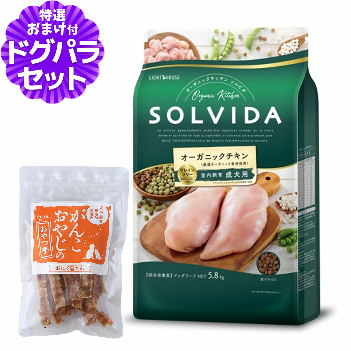SOLVIDA ソルビダ グレインフリーチキン 室内飼育成犬用の解説 『人の赤ちゃん基準の安心素材』愛犬にも「人と同じ基準」の食材を。 食品添加物や農薬などを使わない安全性にこだわった原材料のみを使用し、安心して与え続けられるプレミアムドッグフードをお届けします。 『理想的な栄養バランス』20種類以上の厳選された原材料を、最新のペット栄養学に基づいて、ワンちゃんに理想的な栄養バランスで配合しています。 『極めて高い嗜好性』安全で栄養バランスに優れていても「おいしくない」食事ではストレスで逆効果。 ワンちゃんが喜んで食べる「食いつき」にもこだわりました。 ソルビダ グレインフリーチキン 室内飼育成犬用の詳細 対象 全犬種・室内飼育成犬用 ソルビダ グレインフリーチキン 室内飼育成犬用について 運動量が不足しがちな室内飼育のワンちゃんのためにカロリーは控えめに作られています。 高品質なオーガニックチキン、厳選された野菜やフルーツなど、新鮮なオーガニック原材料を贅沢に使用し、理想的な栄養をバランスよく愛犬に提供します。 さらにアレルギーに配慮し、穀物類は一切使用しておりませんので、腸に負担をかけることなく消化ができます。 また、ユッカシジゲラ抽出物を配合することで、体臭や便臭の軽減をサポートします。 ・食物アレルギー、穀物類の消化が苦手な愛犬に配慮したグレインフリー(穀物不使用)。 ・穀物の代わりに栄養価が高く消化に優れた豆類を使用。 ・USDA(米国農務省)の厳しいオーガニック基準をクリア。 ・AAFCO栄養基準(総合栄養食) その他 直射日光を避け、風通しの良い場所に保管してください。 ※当店の商品は全て正規品です。 安心してお買い求めください。 ■パッケージ・内容成分などは予告なく変更になることがございます。 ご了承くださいませ。 ソルビダ/インドア/室内犬/アダルト/成犬用/チキン/グレインフリー/ドッグフード原材料 オーガニックチキン生肉、乾燥チキン、オーガニック乾燥豆類、オーガニックエンドウ豆粉、オーガニックタピオカ粉、オーガニック乾燥ヒヨコ豆、オーガニック乾燥アルファルファ、オーガニックひまわり油*、天然フレーバー、オーガニック挽き割りフラックスシード、オーガニック乾燥ジャガイモ、鶏脂肪*、エンドウ豆でんぷん、乾燥サーモン、乾燥トマト繊維、乾燥レンズ豆、サーモンオイル*、乾燥ビール酵母、チキン軟骨(グルコサミン、コンドロイチン源)、タウリン、オーガニックひまわりの種、乾燥かぼちゃ、乾燥ブルーベリー、オーガニック乾燥にんじん、乾燥ブロッコリー、加水分解酵母(マンナンオリゴ糖源)、乾燥チコリ根(イヌリン、フラクトオリゴ糖源)、乾燥セージ、乳酸、ユッカフォーム抽出物、ガーリックパウダー、ミネラル類(食塩、塩化カリウム、プロテイネイテッド亜鉛、プロテイネイテッド鉄、プロテイネイテッド銅、プロテイネイテッドマンガン、ヨウ素酸カルシウム、セレニウム酵母)、ビタミン類(塩化コリン、ビタミンE補助食品、ナイアシン補助食品、ビタミンB1硝酸塩、D-パントテン酸カルシウム、ビタミンA補助食品、ビタミンB6、リボフラビン補助食品、ビタミンD3補助食品、ビオチン、ビタミンB12補助食品、葉酸)、プロバイオティクス微生物(イースト菌、乳酸菌、麹菌、糸状菌、枯草菌)、酸化防止剤(ミックストコフェロール) *ミックストコフェロールで保存 保証成分 たんぱく質25%以上、脂質15%以上、粗繊維5.5%以下、粗灰分9%以下、水分10%以下、カリウム1.1%、ナトリウム0.4%、セレニウム酵母0.35mg/kg以上、ビタミンA 5,000 IU/kg以上、ビタミンE 50 IU/kg以上、オメガ6脂肪酸2.5%以上、オメガ3脂肪酸0.85%以上、リン1.1% カロリー 350kcal/100g 原産国 アメリカ 対象年齢 室内飼育成犬用 給与量目安 上記の給与量はあくまでも目安です。 ペットの犬種、運動量、健康状態、体重などによって、給与量を調節し、与えすぎに注意してください。 ・1日の給与量を数回に分けて与えてください。 ・ソルビダは、バランスのとれた栄養分を配合しております。 ビタミンやミネラルなどの栄養分を添加する必要はありません。 ・常に新鮮な水を用意してください。 ソルビダ グレインフリーへの切り替えに際してのお願い 穀物入りのフードからグレインフリー(穀物不使用)フードへ切り替える場合、腸内の消化酵素の準備が整うまで、便がゆるくなる場合がございます。 ワンちゃんの胃腸に負担がかからないよう、少量を従来のフードに混ぜて1週間〜10日ほどかけて、切り替えるようにしてください。 ご注意 ※開封後は、空気を抜いて開封口をしっかり閉じ、乾燥した涼しい場所で保管してください。 ※合成保存料並びに人工の酸化防止剤は使用しておりませんので、賞味期限にかかわらず開封後は早めに与えてください。 ※ソルビダのパッケージは閉めやすく密封性の高い「トリプルジッパー」を採用しています。 機密性に優れ、ソルビダを清潔に保存します。 商品につい