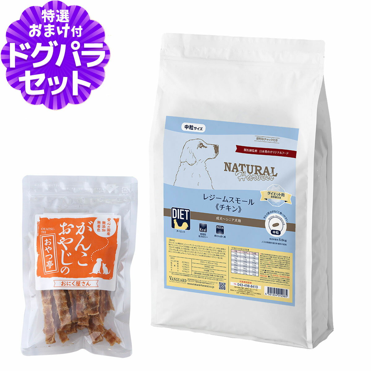 ナチュラルハーベストの解説 ナチュラルハーベストは、日本特有の気候や環境を考えて、日本に住む犬の為に設計された日本発オリジナルドッグフード。 遺伝子組み換え作物を使用せず、アレルギーになりにくいとされる肉類をできるだけ主要たんぱく質にするなど、栄養学に基づいて原材料を取り入れているプレミアムドッグフードです。 ナチュラルハーベスト レジーム スモール チキンの詳細 対象 成犬〜シニア犬用 ナチュラルハーベスト レジーム スモール チキン について ■ダイエット 主要たんぱく質源には嗜好性の良いチキンを採用。 低脂肪・高たんぱく質なフードで筋肉量を増やし、基礎代謝を上げて、健康的な体重管理をサポート。 ■低脂肪・低カロリー 脂肪分は総合栄養食としてのAAFCO栄養基準の基準値ギリギリまで抑えました。 ■高たんぱく質 健康的なダイエットのために、筋肉のもととなるたんぱく質をしっかりと配合。 豊富なたんぱく質と適度な運動で筋肉量を増やして消費カロリーを増やします。 その他 ■パッケージ・内容成分などは予告なく変更になることがございます。 ご了承くださいませ。 ※当店の商品は全て正規品です。 安心してお買い求めください。 小粒/療法食/ダイエット/減量用/体重管理/低脂肪/ドッグフード/ダイエット用食事療法食/ドックフード商品名 ナチュラルハーベスト レジーム スモール チキン 健康的に体重を管理したい子のためのダイエットフード 商品特長 原材料 チキンミール、精製白米、メンハーデンミール、玄米、セルロース、ポテト、オーツ胚芽、酵素分解チキンエキス、えんどう豆繊維、大麦、酵母、海塩、フラクトオリゴ糖、キレート亜鉛、キレート鉄、グルコサミン塩酸塩、コンドロイチン硫酸塩、ユッカ抽出物、ビタミンE、キレート銅、キレートマンガン、L-カルニチン、ナイアシン、セレン酸ナトリウム、パントテン酸カルシウム、リボフラビン、ビタミンA、ビオチン、硝酸チアミン、ビタミンD3、塩酸ピリドキシン、ビタミンB12、ヨウ化カルシウム、葉酸、アシドフィルス菌、フェシウム菌、カゼイ菌、プランタルム菌、酸化防止剤(ローズマリー抽出物) 保証成分 たんぱく質 25.0%以上, 脂質 5.0%以上, 粗繊維 10.0%以下, 灰分 5.5%以下, 水分 10.0%以下 カロリー 286kcal/100g 原産国 米国 対象年齢 成犬〜シニア犬用 給与量目安 ・現在の体重を維持する場合は上表の〔1維持〕を、減量する場合は〔2減量〕を目安に便の状態、毛ヅヤなどを見ながら適宜調節してください。 なお、 理想体重の必要量を与えるのではなく、現在の体重から給与量を決定してください。 ・本品はAAFCO栄養基準に適合しており、本品と新鮮な水だけで必要な栄養素を満たすことができます。 ・初めて与える際は1週間ほどかけて徐々に切り替えてください。 ご注意 ・冷暗所で保管し、開封後はお早めにご使用ください。 ・天然の原材料を使用し、人工の着色料や香料を使用していないため、色やにおい、粒の大きさに違いが見られます。 ・粒の中に有色の小片が見られる場合がありますが、ミネラルなどの栄養素です ・粒の中に原材料である食肉の体毛が一部残る場合があります。 商品についてのお知らせ ナチュラルハーベスト レジームスモール チキン 5.5kg+国産たじま鶏ジャーキー40g 犬 ドッグフード 13,420 円