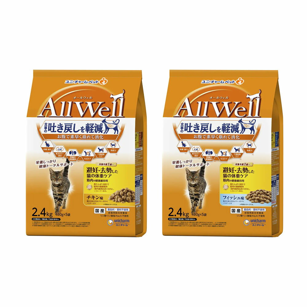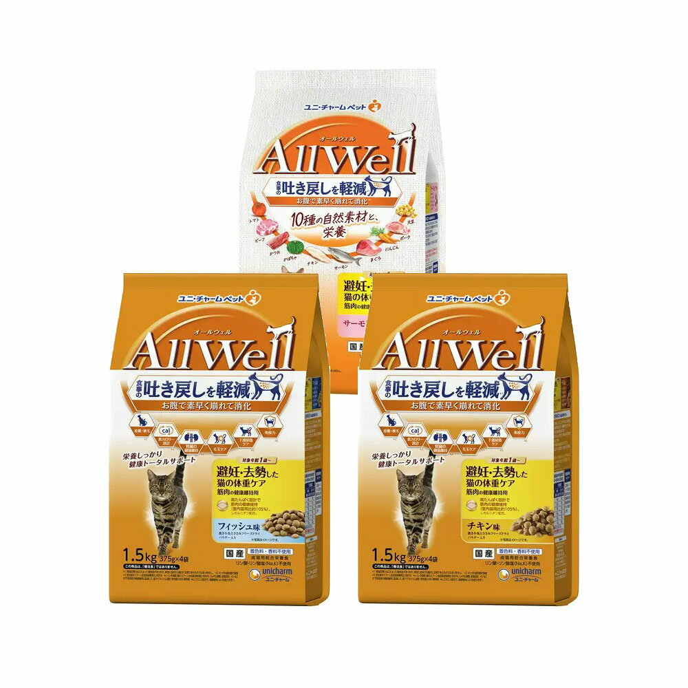 メーカー:ユニチャーム食事の吐き戻しを軽減し、10種の自然素材と栄養を!オールウェル 避妊・去勢した猫の体重ケア 筋肉の健康維持用 3種各1袋対象猫タイプドライフード機能総合栄養食ライフステージ1歳以上の成猫セット内容・オールウェル ドライ 10種の自然素材と栄養 避妊・去勢した猫の体重ケア 筋肉の健康維持用 サーモン・ツナ味 吐き戻し軽減 1.2kg(300g×4袋)×1・オールウェル 避妊・去勢した猫の体重ケア 筋肉の健康維持用 チキン味 挽き小魚とささみフリーズドライパウダー入り 1.5kg(375g×4袋)×1・オールウェル 避妊・去勢した猫の体重ケア 筋肉の健康維持用 フィッシュ味 挽き小魚とささみフリーズドライパウダー入り 1.5kg(375g×4袋)×1特長【10種の自然素材と栄養 避妊・去勢した猫の体重ケア 筋肉の健康維持用 サーモン・ツナ味 吐き戻し軽減】●猫が大好きなサーモンとツナの旨みが詰まった粒に、挽き小魚をまぶした高い嗜好性の総合栄養食です。 ●独自の食物繊維配合技術で、お腹の中で粒が素早くふやけて崩れるので、ドライフードを粒のまま吐き戻す事を軽減します。 ●高たんぱく設計で筋肉の健康維持(室内猫用比約105%)。 L−カルニチンを配合しています。 【避妊・去勢した猫の体重ケア 筋肉の健康維持用 チキン味 挽き小魚とささみフリーズドライパウダー入り】【避妊・去勢した猫の体重ケア 筋肉の健康維持用 フィッシュ味 挽き小魚とささみフリーズドライパウダー入り】●避妊・去勢後の愛猫の筋肉の健康維持に配慮した総合栄養食です。 ●食事の吐き戻し軽減を中心とした、7つの機能で健康サポートします。 ●室内猫用比 約105%の高たんぱく設計で、L−カルニチンを配合しました。 ●猫が大好きなチキン、フィッシュの旨みが詰まった粒に、挽き小魚と微粉砕したささみフリーズドライをまぶした嗜好性の高いフードです。 ●着色料・香料不使用で、安心の国産商品です。 原材料【10種の自然素材と栄養 避妊・去勢した猫の体重ケア 筋肉の健康維持用 サーモン・ツナ味 吐き戻し軽減】穀類(小麦粉、トウモロコシ、コーングルテンミール、パン粉)、肉類(チキンミール、ポークミール、チキンエキス、ビーフミール、チキン*、ビーフ*、ポーク*)、動物性油脂、セルロースパウダー(食物繊維源)、魚介類(フィッシュミール、フィッシュエキス、サーモンエキス*、かつお節、煮干パウダー、まぐろ(ツナ)ミール*、かつおミール*、白身魚ミール、乾燥シラス)、野菜類(ビートパルプ、にんじんパウダー*、かぼちゃパウダー*、トマトパウダー*)、酵母、大豆*、ミネラル類(カルシウム、塩素、コバルト、銅、鉄、ヨウ素、カリウム、マンガン、ナトリウム、亜鉛)、ビタミン類(A、B1、B2、B6、B12、C、D、E、K、コリン、ナイアシン、パントテン酸、ビオチン、葉酸)、調味料、アミノ酸類(タウリン)、L−カルニチン、酸化防止剤(ミックストコフェロール、ハーブエキス)*10種の自然素材【避妊・去勢した猫の体重ケア 筋肉の健康維持用 チキン味 挽き小魚とささみフリーズドライパウダー入り】穀類(トウモロコシ、コーングルテンミール、パン粉)、肉類(ポークミール、チキンミール、ビーフミール、チキンエキス、乾燥鶏肉加工品粉末)、魚介類(フィッシュミール、フィッシュエキス、煮干パウダー、かつお節)、セルロースパウダー、動物性油脂、野菜類(ビートパルプ)、糖類(オリゴ糖)、ビール酵母、ミネラル類(カルシウム、塩素、コバルト、銅、鉄、ヨウ素、カリウム、マンガン、リン、亜鉛)、ビタミン類(A、B1、B2、B6、B12、C、D、E、K、コリン、ナイアシン、パントテン酸、ビオチン、葉酸)、アミノ酸類(タウリン、メチオニン)、L−カルニチン、酸化防止剤(ミックストコフェロール、ハーブエキス)【避妊・去勢した猫の体重ケア 筋肉の健康維持用 フィッシュ味 挽き小魚とささみフリーズドライパウダー入り】穀類(トウモロコシ、コーングルテンミール、パン粉)、肉類(チキンミール、ポークミール、ビーフミール、チキンエキス、乾燥鶏肉加工品粉末)、魚介類(フィッシュミール、フィッシュエキス、煮干パウダー、かつお節、まぐろミール、かつおミール、白身魚ミール、乾燥シラス)、セルロースパウダー、油脂類、野菜類(ビートパルプ)、糖類(オリゴ糖)、ビール酵母、ミネラル類(カルシウム、塩素、コバルト、銅、鉄、ヨウ素、カリウム、マンガン、リン、亜鉛)、ビタミン類(A、B1、B2、B6、B12、C、D、E、K、コリン、ナイアシン、パントテン酸、ビオチン、葉酸)、アミノ酸類(タウリン、メチオニン)、L−カルニチン、酸化防止剤(ミックストコフェロール、ハーブエキス)保証成分【10種の自然素材と栄養 避妊・去勢した猫の体重ケア 筋肉の健康維持用 サーモン・ツナ味 吐き戻し軽減】タンパク質:32.0%以上、脂質:14.0%以上、粗繊維:9.0%以下、粗灰分:7.0%以下、水分:10.0%以下ビタミンA:10000IU/kg以上、ビタミンE:80IU/kg以上、ビタミンB1:5.6mg/kg以上、ビタミンB2:5.6mg/kg以上カルシウム:0.90%、リン:0.70%、ナトリウ