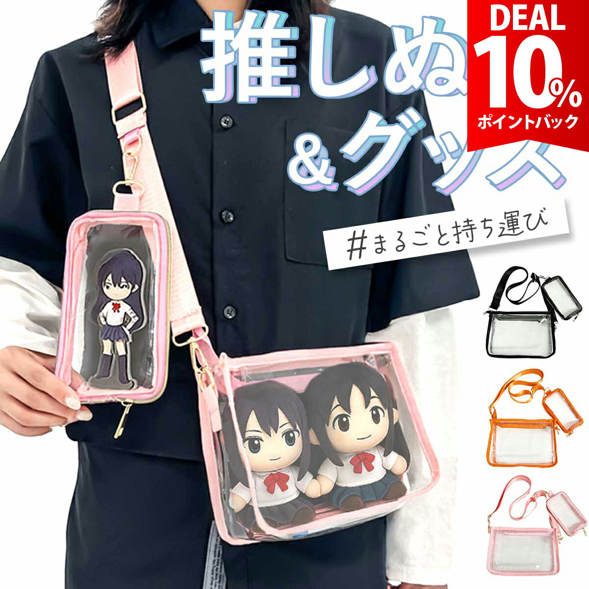 【アクスタケース付き!】痛バッグ アクスタケース 大きめ クリアバッグ 15cm ぬいぐるみ バッグ 2体 ぬいぐるみポーチ ショルダー 透明バッグ 痛バ 推し活 推し活バッグ 20cm ぬいポーチ ぬいぐるみ アクスタ 持ち運び クリアポーチ ぬい活 ・ミニポーチ付きでグッズを目立つ位置に簡単にディスプレイできる。 ・アクスタケースは16cm×8.5cmのビッグサイズでアクスタをパッケージごと収納可能 ・透明素材で全面から光を取り込み、パイピングテープがグッズを際立たせる ・ミニポーチとストラップ込みで168gの超軽量設計で長時間でも負担軽減 ・取り外し可能なミニポーチで、バッグ、ポーチを自由にカスタマイズして使用可能 ご購入から30日間はメーカー保証付きです。 メーカー希望小売価格はメーカーサイトに基づいて掲載していますya845 ・ミニポーチ付きでグッズを目立つ位置に簡単にディスプレイできる。 ・アクスタケースは16cm×8.5cmのビッグサイズでアクスタをパッケージごと収納可能 ・透明素材で全面から光を取り込み、パイピングテープがグッズを際立たせる ・ミニポーチとストラップ込みで168gの超軽量設計で長時間でも負担軽減 ・取り外し可能なミニポーチで、バッグ、ポーチを自由にカスタマイズして使用可能 ■セット内容■ バッグ本体、ポーチ、ショルダーストラップ(アジャスター付き) ■サイズ(約)■ バッグ本体:24cmx17cmx8cm ポーチ:17.5cmx10.5cm ショルダーストラップ:92-146cm(金具含む) ※寸法は手作業にて計測しているため、若干の誤差がある場合がございます。 ■カラーバリエーション■ 全3色(ブラック・ピンク・オレンジ) ■素材■ PVC ■重量■ ポーチ本体 106g ポーチ 48g ショルダーストラップ 60g ※商品写真はできる限り実物の色に近づけるよう調整しておりますが、お客様のお使いのモニター設定、お部屋の照明等により実際の商品と色味が異なる場合がございます。 恐れ入りますが色味が理由によるご返品はお受けしておりませんので、予めご了承ください。 ご注文前にご確認下さい ●よくあるご質問● 【スーパーDEAL10%還元】【アクスタケース付き!】痛バッグ アクスタケース 大きめ クリアバッグ 15cm ぬいぐるみ バッグ 2体 ぬいぐるみポーチ ショルダー 1,699 円
