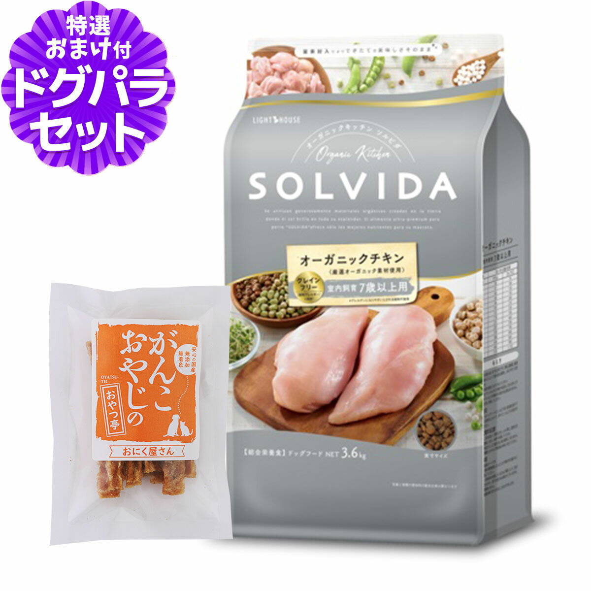 SOLVIDA ソルビダ グレインフリーチキン 室内飼育7歳以上用の解説 『人の赤ちゃん基準の安心素材』愛犬にも「人と同じ基準」の食材を。 食品添加物や農薬などを使わない安全性にこだわった原材料のみを使用し、安心して与え続けられるプレミアムドッグフードをお届けします。 『理想的な栄養バランス』20種類以上の厳選された原材料を、最新のペット栄養学に基づいて、ワンちゃんに理想的な栄養バランスで配合しています。 『極めて高い嗜好性』安全で栄養バランスに優れていても「おいしくない」食事ではストレスで逆効果。 ワンちゃんが喜んで食べる「食いつき」にもこだわりました。 ソルビダ グレインフリーチキン 室内飼育7歳以上用の詳細 対象 全犬種・室内飼育7歳以上シニア犬用 ソルビダ グレインフリーチキン 室内飼育7歳以上用について いつまでも健康で長生きしてほしいから。 シニア犬の健康を深く追求した7歳以上用ソルビダは、抗酸化食材をふんだんに使い、消化吸収の良い動物性たんぱく質を主原料として、おいしさはそのままに成犬用に比べカロリーと脂質を抑えました。 さらにアレルギーに配慮し、穀物類は一切使用しておりませんので、腸に負担をかけることなく消化ができます。 また、ユッカシジゲラ抽出物を配合することで、体臭や便臭の軽減をサポートします。 ・消化吸収に優れた良質のたんぱく源が主原料。 衰えやすい筋肉の維持にも配慮。 ・加齢に伴い低下する基礎代謝を考慮し、脂質とカロリーを控えめ。 ・抗酸化物質を豊富に含む食材をふんだんに使用。 ・食物アレルギー、穀物類の消化が苦手な愛犬に配慮したグレインフリー(穀物不使用)。 ・穀物の代わりに栄養価が高く消化に優れた豆類を使用。 ・自然の中でのびのび育ったオーガニックチキンをたんぱく源のベースとして使用し、オーガニック野菜やフルーツをバランスよく配合。 ・USDA(米国農務省)の厳しいオーガニック基準をクリア。 ・AAFCO栄養基準(総合栄養食) その他 直射日光を避け、風通しの良い場所に保管してください。 ※当店の商品は全て正規品です。 安心してお買い求めください。 ■パッケージ・内容成分などは予告なく変更になることがございます。 ご了承くださいませ。 ソルビダ/インドア/室内犬/シニア/チキン/グレインフリー/ドッグフード原材料 オーガニックチキン生肉、乾燥チキン、オーガニック乾燥豆類、オーガニックエンドウ豆粉、オーガニック乾燥ヒヨコ豆、オーガニックタピオカ粉、オーガニック乾燥アルファルファ、オーガニック挽き割りフラックスシード、天然フレーバー、鶏脂肪*、乾燥サーモン、オーガニック乾燥ジャガイモ、エンドウ豆でんぷん、乾燥トマト繊維、オーガニック乾燥ケルプ、オーガニック乾燥リンゴ繊維、オーガニックひまわり油*、乾燥ビール酵母、サーモンオイル*、チキン軟骨(グルコサミン、コンドロイチン源)、タウリン、オーガニックひまわりの種、乾燥かぼちゃ、乾燥ブルーベリー、オーガニック乾燥にんじん、乾燥ブロッコリー、加水分解酵母(マンナンオリゴ糖源)、オーガニック乾燥クランベリー、乾燥チコリ根(イヌリン、フラクトオリゴ糖源)、乾燥セージ、乳酸、ユッカフォーム抽出物、ガーリックパウダー、ミネラル類(プロテイネイテッド亜鉛、プロテイネイテッド鉄、プロテイネイテッド銅、プロテイネイテッドマンガン、食塩、ヨウ素酸カルシウム、セレニウム酵母、塩化カリウム)、ビタミン類(塩化コリン、ビタミンE補助食品、ナイアシン補助食品、ビタミンB1硝酸塩、D-パントテン酸カルシウム、ビタミンA補助食品、ビタミンB6、リボフラビン補助食品、ビタミンD3補助食品、ビオチン、ビタミンB12補助食品、葉酸)、プロバイオティクス微生物(イースト菌、乳酸菌、麹菌、糸状菌、枯草菌)、酸化防止剤(ミックストコフェロール) *ミックストコフェロールで保存 保証成分 たんぱく質23%以上、脂質10%以上、粗繊維6%以下、粗灰分8%以下、水分10%以下、カリウム1.0%、ナトリウム0.2%、セレニウム酵母0.35mg/kg以上、ビタミンA 5,000 IU/kg以上、ビタミンE 50 IU/kg以上、オメガ6脂肪酸2.0%以上、オメガ3脂肪酸1.25%以上、リン1.0% カロリー 330kcal/100g 原産国 アメリカ 対象年齢 室内飼育7歳以上シニア犬用 給与量目安 上記の給与量はあくまでも目安です。 ペットの犬種、運動量、健康状態、体重などによって、給与量を調節し、与えすぎに注意してください。 ・1日の給与量を数回に分けて与えてください。 ・ソルビダは、バランスのとれた栄養分を配合しております。 ビタミンやミネラルなどの栄養分を添加する必要はありません。 ・常に新鮮な水を用意してください。 ソルビダ グレインフリーへの切り替えに際してのお願い 穀物入りのフードからグレインフリー(穀物不使用)フードへ切り替える場合、腸内の消化酵素の準備が整うまで、便がゆるくなる場合がございます。 ワンちゃんの胃腸に負担がかからないよう、少量を従来のフードに混ぜて