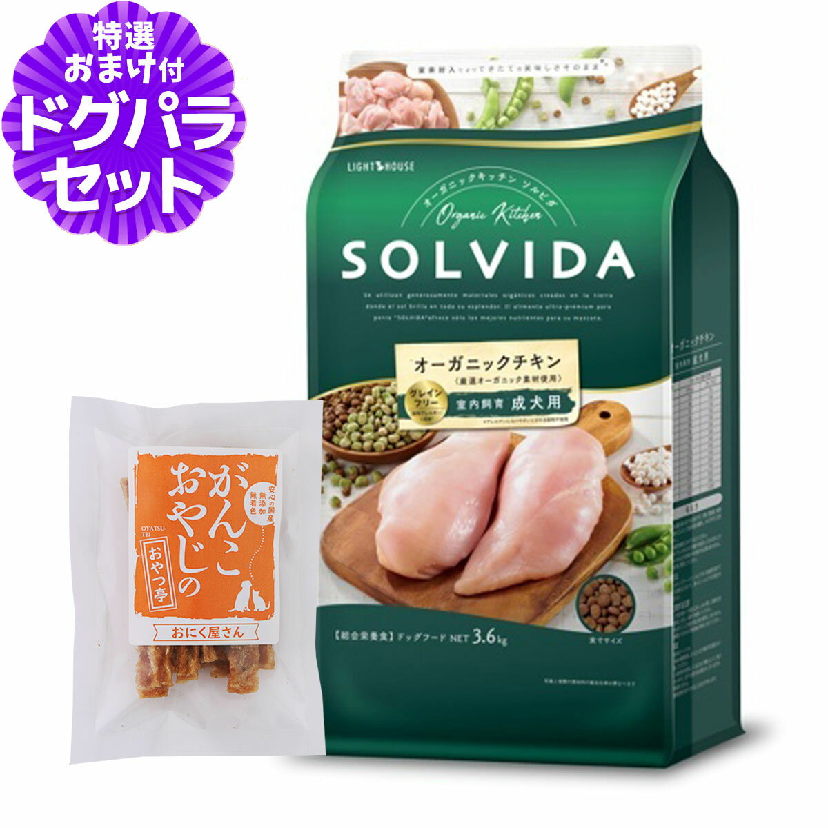 SOLVIDA ソルビダ グレインフリーチキン 室内飼育成犬用の解説 『人の赤ちゃん基準の安心素材』愛犬にも「人と同じ基準」の食材を。 食品添加物や農薬などを使わない安全性にこだわった原材料のみを使用し、安心して与え続けられるプレミアムドッグフードをお届けします。 『理想的な栄養バランス』20種類以上の厳選された原材料を、最新のペット栄養学に基づいて、ワンちゃんに理想的な栄養バランスで配合しています。 『極めて高い嗜好性』安全で栄養バランスに優れていても「おいしくない」食事ではストレスで逆効果。 ワンちゃんが喜んで食べる「食いつき」にもこだわりました。 ソルビダ グレインフリーチキン 室内飼育成犬用の詳細 対象 全犬種・室内飼育成犬用 ソルビダ グレインフリーチキン 室内飼育成犬用について 運動量が不足しがちな室内飼育のワンちゃんのためにカロリーは控えめに作られています。 高品質なオーガニックチキン、厳選された野菜やフルーツなど、新鮮なオーガニック原材料を贅沢に使用し、理想的な栄養をバランスよく愛犬に提供します。 さらにアレルギーに配慮し、穀物類は一切使用しておりませんので、腸に負担をかけることなく消化ができます。 また、ユッカシジゲラ抽出物を配合することで、体臭や便臭の軽減をサポートします。 ・食物アレルギー、穀物類の消化が苦手な愛犬に配慮したグレインフリー(穀物不使用)。 ・穀物の代わりに栄養価が高く消化に優れた豆類を使用。 ・USDA(米国農務省)の厳しいオーガニック基準をクリア。 ・AAFCO栄養基準(総合栄養食) その他 直射日光を避け、風通しの良い場所に保管してください。 ※当店の商品は全て正規品です。 安心してお買い求めください。 ■パッケージ・内容成分などは予告なく変更になることがございます。 ご了承くださいませ。 ソルビダ/インドア/室内犬/アダルト/成犬用/チキン/グレインフリー/ドッグフード原材料 オーガニックチキン生肉、乾燥チキン、オーガニック乾燥豆類、オーガニックエンドウ豆粉、オーガニックタピオカ粉、オーガニック乾燥ヒヨコ豆、オーガニック乾燥アルファルファ、オーガニックひまわり油*、天然フレーバー、オーガニック挽き割りフラックスシード、オーガニック乾燥ジャガイモ、鶏脂肪*、エンドウ豆でんぷん、乾燥サーモン、乾燥トマト繊維、乾燥レンズ豆、サーモンオイル*、乾燥ビール酵母、チキン軟骨(グルコサミン、コンドロイチン源)、タウリン、オーガニックひまわりの種、乾燥かぼちゃ、乾燥ブルーベリー、オーガニック乾燥にんじん、乾燥ブロッコリー、加水分解酵母(マンナンオリゴ糖源)、乾燥チコリ根(イヌリン、フラクトオリゴ糖源)、乾燥セージ、乳酸、ユッカフォーム抽出物、ガーリックパウダー、ミネラル類(食塩、塩化カリウム、プロテイネイテッド亜鉛、プロテイネイテッド鉄、プロテイネイテッド銅、プロテイネイテッドマンガン、ヨウ素酸カルシウム、セレニウム酵母)、ビタミン類(塩化コリン、ビタミンE補助食品、ナイアシン補助食品、ビタミンB1硝酸塩、D-パントテン酸カルシウム、ビタミンA補助食品、ビタミンB6、リボフラビン補助食品、ビタミンD3補助食品、ビオチン、ビタミンB12補助食品、葉酸)、プロバイオティクス微生物(イースト菌、乳酸菌、麹菌、糸状菌、枯草菌)、酸化防止剤(ミックストコフェロール) *ミックストコフェロールで保存 保証成分 たんぱく質25%以上、脂質15%以上、粗繊維5.5%以下、粗灰分9%以下、水分10%以下、カリウム1.1%、ナトリウム0.4%、セレニウム酵母0.35mg/kg以上、ビタミンA 5,000 IU/kg以上、ビタミンE 50 IU/kg以上、オメガ6脂肪酸2.5%以上、オメガ3脂肪酸0.85%以上、リン1.1% カロリー 350kcal/100g 原産国 アメリカ 対象年齢 室内飼育成犬用 給与量目安 上記の給与量はあくまでも目安です。 ペットの犬種、運動量、健康状態、体重などによって、給与量を調節し、与えすぎに注意してください。 ・1日の給与量を数回に分けて与えてください。 ・ソルビダは、バランスのとれた栄養分を配合しております。 ビタミンやミネラルなどの栄養分を添加する必要はありません。 ・常に新鮮な水を用意してください。 ソルビダ グレインフリーへの切り替えに際してのお願い 穀物入りのフードからグレインフリー(穀物不使用)フードへ切り替える場合、腸内の消化酵素の準備が整うまで、便がゆるくなる場合がございます。 ワンちゃんの胃腸に負担がかからないよう、少量を従来のフードに混ぜて1週間〜10日ほどかけて、切り替えるようにしてください。 ご注意 ※開封後は、空気を抜いて開封口をしっかり閉じ、乾燥した涼しい場所で保管してください。 ※合成保存料並びに人工の酸化防止剤は使用しておりませんので、賞味期限にかかわらず開封後は早めに与えてください。 ※ソルビダのパッケージは閉めやすく密封性の高い「トリプルジッパー」を採用しています。 機密性に優れ、ソルビダを清潔に保存します。 商品につい