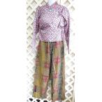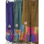 生産国インド 素材綿 平置き寸法ウエスト30〜45センチ前後 腰周り52センチ前後 丈100センチ前後 又上40センチ前後 太ももまわり30センチ前後 厚地のコットンに裏地付 カーキ色のパッチワークの表地に、ガーゼ生地の裏地は、秋冬でも暖かです。 ゴムウエストでおなか周りはらくらく |