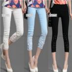刺繍レースがおしゃれな七分丈のレギパンですウエスト58-98腿まわり36-52ヒップ70-110パンツ丈66cmコットン、ポリエステル |