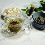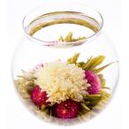 えんぎの良い黄色に、真っ白なジャスミン、紅い千日紅のお花がアクセントとなり、ガラスの中に花束が表れます。 [中国工芸茶] |