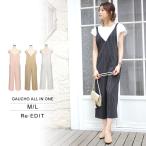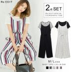 [2点セット] オールインワン ガウチョ Tシャツ トップス カットソー レイヤード ポンチ素材 レーヨン混 ガウチョオールインワンとTシャツのスペシャルコーディネートSETが登場です。 今季も引き続き注目の、ガウチョシルエットがポイントのキャミタイプオールインワンは 型崩れのしにくい、やや厚手のポンチ生地を使用して見た目も上品なイメージに仕上げました。 ウエストにはゴムを使用し、ブラウジングするとメリハリのあるシルエットが完成します。 印象的なストライプ&オルテガプリントはここでしか手に入らないリエディオリジナル柄。 シックな色合いで夏から秋までロングシーズンご愛用いただけます。 シンプルなTシャツは滑らかな肌触りと、とろみのある落ち感が自慢のレーヨン混生地を使用。 オールインワン・Tシャツ共に伸縮性のある生地で、リラックスした着心地をかなえてくれます。 それぞれ別々にシングルユースも出来るので、コーデの幅がグッと広がるアイテムです。 ※サイズは画像スペックをご参照ください。