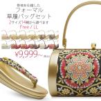 草履バックコレクション バッグと草履の鼻緒に高級な帯地を使用した 草履バッグセットです。 こちらの商品はメーカーから直接大量に仕入いれて おりますので、大幅なマージンカットを実現しました! 色・柄ともに、幅広い年齢層の方にご使用頂けるよう、 厳選してセレクトしました。 <br> 数に限りがございますので、ご注文はお早めにお願いします。 ご注文時にプルダウンメニューで選択して下さい。 価格はご注文後に訂正させて頂きます。 ■サイズ ・バッグ 幅:約21cm<br> 高さ:約14cm(取っ手部分含まず) マチ:約9cm ・草履<br> 長さ:約24cm 高さ:約5cm(カカト部分) ・適応サイズ 23cm〜25cmの方に適応します。