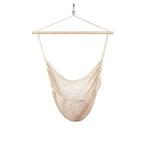 職人が一つ一つ手作業で編んだチェアハンモックは外はもちろん室内でもあらゆるインテリアにマッチするナチュラルカラーのハンモックタイプのチェアです。 梁や木に一点で吊るせるので設置はとても簡単です。 日本人の体格・体重を考慮し、きめ細かく編んであるため省スペースでも伸縮性が高く足を伸ばしても窮屈感はなく、体全体が包こまれるようなフィット感を得られるため椅子やソファとは違った感覚でリラックスできます。 寝ころぶのが主体のハンモックに対してチェアハンモックは読書や映画鑑賞などに、長時間座っていても驚くほど快適です。 U型フック、カラビナ、ロープ300cmが付属されています。 誰でもすぐにチェアハンモックを楽しんでほしいのでご用意しました。 複雑なロープワークができなくても気軽にお使いいただけます。