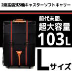通常時外寸:47×54×30cm総外寸:50×54×30cm容量:約68L 1段拡張時外寸:47×54×30cm総外寸:63×54×30cm容量:約88L 2段拡張時外寸:47×54×30cm総外寸:77×54×30cm容量:約103L 重量:2.5kg素材:オックスフォード防水布 最大容量125L長期旅行向けソフトキャリー 3段階拡張で68L〜125Lまで対応14泊。 長期出張や、ホームステイ、家族全ての荷物を収納するときに役に立つ大容量ソフトキャリーです。 本体はオックスフォード防水布、内装は塩化ビニル素材で徹底的に防水を施しました。