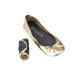 くるくる丸めて携帯に便利♪くるんと丸めて持ち運べるバレエシューズタイプのポケッタブルシューズ!使い方はアイデア次第!オフィスや自宅のルームシューズ、ホテルや飛行機の中のセカンドシューズ、授業参観に必要な携帯スリッパ、ドライビングシューズ、外出先で歩き疲れた時や足が痛い時のレスキューシューズ。 足にフィットする柔らかなメタリック素材のグリッターゴールド、ラグジュアリーでインパクトがあります。