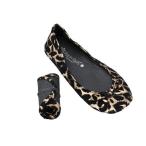 くるくる丸めて携帯に便利♪くるんと丸めて持ち運べるバレエシューズタイプのポケッタブルシューズ!使い方はアイデア次第!オフィスや自宅のルームシューズ、ホテルや飛行機の中のセカンドシューズ、授業参観に必要な携帯スリッパ、ドライビングシューズ、外出先で歩き疲れた時や足が痛い時のレスキューシューズ。 人気のヒョウ柄、上品な仕上がりです。