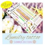 『貼るジュエリーシールLumilry tattoo Summer Edition』 Zipper・Ranzuki・CHOKICHOKI GIRLS・nicolaなどなど今、話題沸騰中!!人気海外ブロガーやファッショニスタたちが大注目!ネオンカラーのピンク・オレンジ・グリーンをたくさん使用!長いデザインはブレスレットやアンクレットに♪切って、貼って、濡らすだけのステップで簡単に貼れるから、気軽にチャレンジできます。 海やプール、フェスのときでも安心。 取り除きたいときはベビーオイルやセロテープなどで落とせます。 リアルなアクセサリーをコンセプトにデザインされているから、街中でもオシャレに使えます。 どんなシーンでもつけられる貼るジュエリー!塩水でアクセサリーが傷む心配がない。 波やスライダーなどで流される心配がない。 切れたりしないから、小さなお子様のママにも安心♪本物のアクセサリーと重ねづけもOK!! 内容量/シール1枚入り |