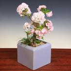 樹種:旭山桜、八重桜、玉竜 撮影日:お花4月冬姿2月 樹高:約20cm鉢径:15cm 4月中旬に美しい花を咲かせます。 一才桜は桜の中でも特に花付きが良く、若木のうちから開花が楽しめる特性を持つ品種です。 花芽をたくさん持っていますので、ミニ盆栽ですが、春にご家庭でお花見を楽しんでいただけます! 卒業やご入学のお祝いやお誕生日ギフト、ホワイトデーなど、春の贈り物にもオススメです! ☆簡単な育て方説明書をお付けいたします。 毎年開花を楽しむ為のコツは、春から夏にたくさんの日光・水を与えることです。 特に日光が重要なので、少し葉が焼けるくらい与えるとたくさん花芽をつけます。 *数量物の為、若干樹形・鉢の色が異なる場合がございます。 11-3月は蕾の状態、4月に開花し、5-10月は葉姿でのお届けとなります。