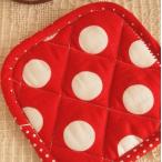 かわいいカラーの綿入りポットマットです。 ポットの下に敷いて、お茶の温度を逃がさない! お揃いのポットカバーと一緒にいかがでしょうか〜 お客様を呼んで、ティーパーティーをしませんか〜 大きな水玉柄がとってもかわいい。 フワフワキルトがあったかい♪ ハンドメイドのため、ひとつひとつ仕上り具合が違います。 サイズ:15cm×15cm 生地:綿100%、中綿:ポリエステル100% |