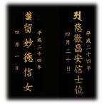 ■ご注文のお位牌又は既にお持ちのお位牌に、戒名・没年月日・俗名・行年などの文字を彫ります。 ■コンピューター制御の彫刻機で文字を彫り、金粉塗料などを埋めて仕上げます。 ■色は、「金」、「白」、「群青」、「赤」など(金色の場合は艶消しとなります。 ) ■書体は、位牌専用書体です。 ■常用漢字に無い漢字は、別料金(1文字1,050円〜)で作ることができます。 1.下記何れかの方法にて、文字内容をご連絡ください。 ・申込用紙に記入してFAX送信 ・申込用紙に記入して郵送 ・メールで文字内容を送信 ・写メールで白木位牌を撮影して送信 *申込用紙はPCでダウンロードして印刷 2.仕上り見本をFAX又はメールにてお送り致します。 3.ご確認いただいた後、良否のご連絡をお願いします。 4.文字入れ作業を行い、速やかに発送致します。 ※ご夫婦二名分の場合には、数量を“2”にしてお申し込みください。