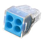 ワゴジャパン WGXシリーズ WGX-4 (1箱100個入) 差込本数:4本 色:ブルー 適応電線:銅単線φ1.6 φ2.0 (通信線等のφ1.2mmにも使用できます) 定格:20A 300V |
